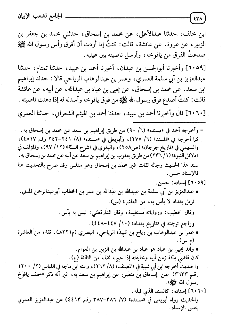 6059 - وَأَخْبَرَنَا أَبُو الْحَسَنِ بْنُ عَبْدَانَ، أَنَا أَحْمَدُ بْنُ عُبَيْدٍ، ثَنَا تَمْتَامٌ، ثَنَا عَبْدُ الْعَزِيزِ بْنُ أَبِي سَلَمَةَ الْعُمَرِيُّ، وَعُمَرُ بْنُ عَبْدِ الْوَهَّابِ الرِّيَاحِيُّ، ثَنَا إِبْرَاهِيمُ بْنُ سَعِيدٍ، عَنْ مُحَمَّدِ بْنِ إِسْحَاقَ، عَنْ يَحْيَى بْنِ عَبَّادِ بْنِ عَبْدِ اللهِ، عَنْ أَبِيهِ، عَنْ عَائِشَةَ قَالَتْ: " كُنْتُ §أُصْدِعُ فَرْقَ رَسُولِ اللهِ صَلَّى اللَّهُ عَلَيْهِ وَسَلَّمَ مِنْ فَوْقِ نَافُوخِهِ وَأَسْدَلَهُ لَهُ إِذَا دَهَنْتُ نَاصِيَتَهُ "