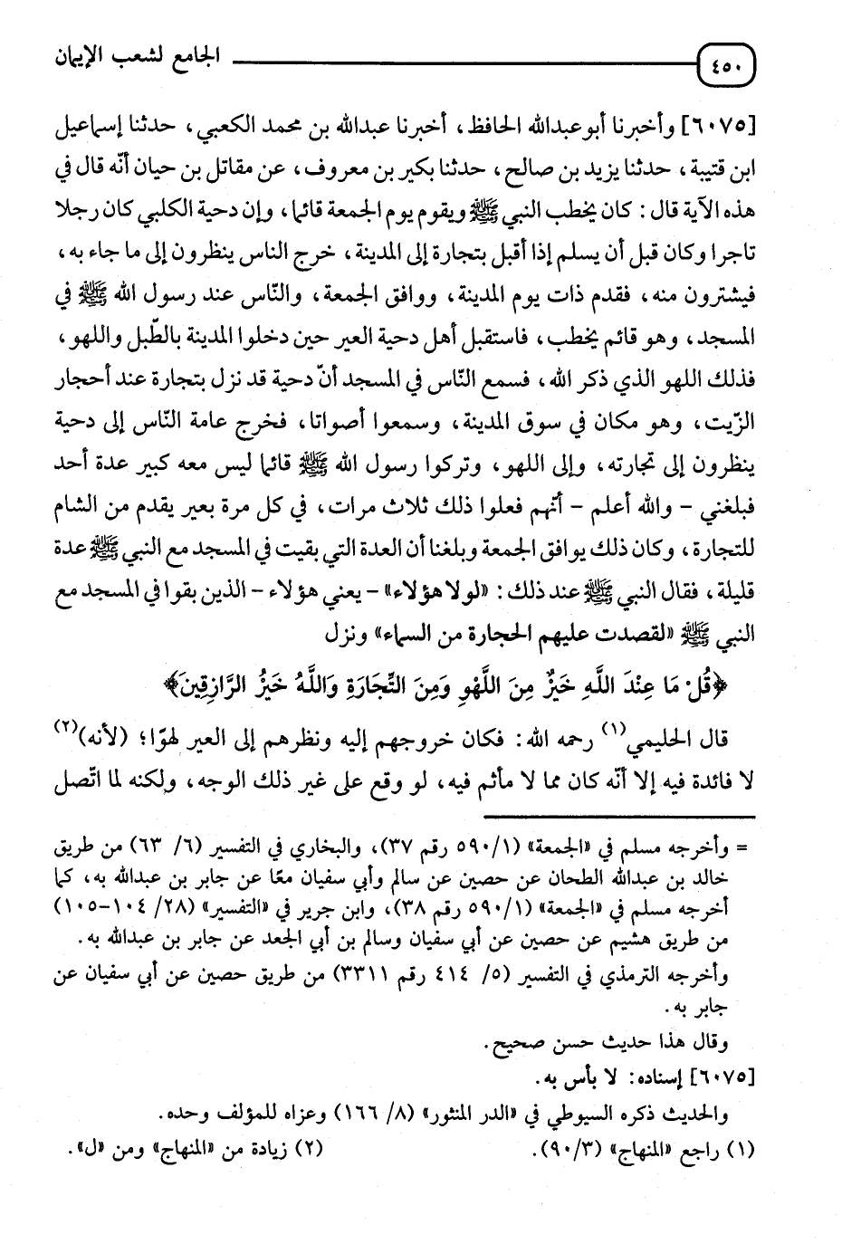 6075 - وَأَخْبَرَنَا أَبُو عَبْدِ اللهِ الْحَافِظُ، أَنَا عُبَيْدُ اللهِ بْنُ مُحَمَّدٍ الْكَعْبِيُّ، ثَنَا إِسْمَاعِيلُ بْنُ قُتَيْبَةَ، ثَنَا يَزِيدُ بْنُ صَالِحٍ، ثَنَا بُكَيْرُ بْنُ مَعْرُوفٍ، عَنْ مُقَاتِلِ بْنِ حَيَّانَ أَنَّهُ قَالَ فِي هَذِهِ الْآيَةِ قَالَ: كَانَ يَخْطُبُ النَّبِيُّ صَلَّى اللَّهُ عَلَيْهِ وَسَلَّمَ §وَيَقُومُ يَوْمَ الْجُمُعَةِ قَائِمًا، وَإِنَّ دِحْيَةَ الْكَلْبِيَّ كَانَ رَجُلًا تَاجِرًا وَكَانَ قَبْلَ أَنْ يُسَلِّمَ إِذَا أَقْبَلَ بِتِجَارَتِهِ إِلَى الْمَدِينَةِ، خَرَجَ النَّاسُ يَنْظُرُونَ إِلَى مَا جَاءَ بِهِ، فَيَشْتَرُونَ مِنْهُ فَقَدِمَ ذَاتَ يَوْمٍ الْمَدِينَةَ، وَوَافَقَ الْجُمُعَةَ وَالنَّاسُ عِنْدَ رَسُولِ اللهِ صَلَّى اللَّهُ عَلَيْهِ وَسَلَّمَ فِي الْمَسْجِدِ، وَهُوَ قَائِمٌ يَخْطُبُ فَاسْتَقْبَلَ أَهْلُ دِحْيَةَ الْعِيرَ دَخَلُوا الْمَدِينَةَ بِالطَّبْلِ واللهْوِ، فَذَلِكَ اللهْوُ الَّذِي ذَكَرَ اللهُ فَسَمِعَ النَّاسُ فِي الْمَسْجِدِ أَنَّ دِحْيَةَ قَدْ نَزَلَ بِتِجَارَةٍ عِنْدَ أَحْجَارِ الزَّيْتِ وَهُوَ مَكَانٌ فِي سُوقِ الْمَدِينَةِ وَسَمِعُوا أَصْوَاتًا، فَخَرَجَ عَامَّةُ النَّاسِ إِلَى دِحْيَةَ يَنْظُرُونَ إِلَى تِجَارَتِهِ وَإِلَى اللهْوِ وَتَرَكُوا رَسُولَ اللهِ صَلَّى اللَّهُ عَلَيْهِ وَسَلَّمَ قَائِمًا لَيْسَ مَعَهُ كَثِيرُ أَحَدٍ، فَبَلَغَنِي وَاللهُ أَعْلَمُ أَنَّهُمْ فَعَلُوا ذَلِكَ ثَلَاثَ مَرَّاتٍ فِي كُلِّ مُرَّةٍ بَعِيرٌ تَقَدَّمَ مِنَ الشَّامِ لِلتِّجَارَةِ وَكَانَ ذَلِكَ يُوَافِقُ الْجُمُعَةَ. وَبَلَغَنَا أَنَّ الْعِدَّةَ الَّتِي بَقِيَتْ فِي الْمَسْجِدِ مَعَ النَّبِيِّ صَلَّى اللَّهُ عَلَيْهِ وَسَلَّمَ عِدَّةٌ قَلِيلَةٌ، فَقَالَ النَّبِيُّ صَلَّى اللَّهُ عَلَيْهِ وَسَلَّمَ عِنْدَ ذَلِكَ: " لَوْلَا هَؤُلَاءِ " - يَعْنِي هَؤُلَاءِ الَّذِينَ بَقُوا فِي الْمَسْجِدِ مَعَ النَّبِيِّ صَلَّى اللَّهُ عَلَيْهِ وَسَلَّمَ - " لِقَصَدَتْ إِلَيْهِمُ الْحِجَارَةُ مِنَ السَّمَاءِ " وَنَزَلَ: {قُلْ مَا عِنْدَ اللهِ خَيْرٌ مِنَ اللهْوِ وَمَنَ التِّجَارَةِ وَاللهُ خَيْرُ الرَّازِقِينَ} [الجمعة: 11] " قَالَ الْحَلِيمِيُّ رَحِمَهُ اللهُ: فَكَانَ خُرُوجُهُمْ إِلَيْهِ وَنَظَرُهُمْ إِلَى الْعِيرِ لَهْوًا لَا فَائِدَةَ فِيهِ إِلَّا أَنَّهُ كَانَ مِمَّا لَا مَأْثَمَ فِيهِ، لَوْ وَقَعَ عَلَى غَيْرِ ذَلِكَ الْوَجْهِ وَلَكِنَّهُ لَمَّا اتَّصَلَ -[451]- بِهِ الْإِعْرَاضُ عَنْ رَسُولِ اللهِ صَلَّى اللَّهُ عَلَيْهِ وَسَلَّمَ وَالِانْفِضَاضُ عَنْ حَضَرَتِهِ، غَلُظَ وَكَبُرَ وَنَزَلَ فِيهِمْ مِنَ الْقُرْآنِ وَتَهْجِينُهُ بِاسْمِ اللهْوِ مَا نَزَلَ وَجَاءَ عَنْ رَسُولِ اللهِ صَلَّى اللَّهُ عَلَيْهِ وَسَلَّمَ فَذَكَرَ الْحَدِيثَ الَّذِي