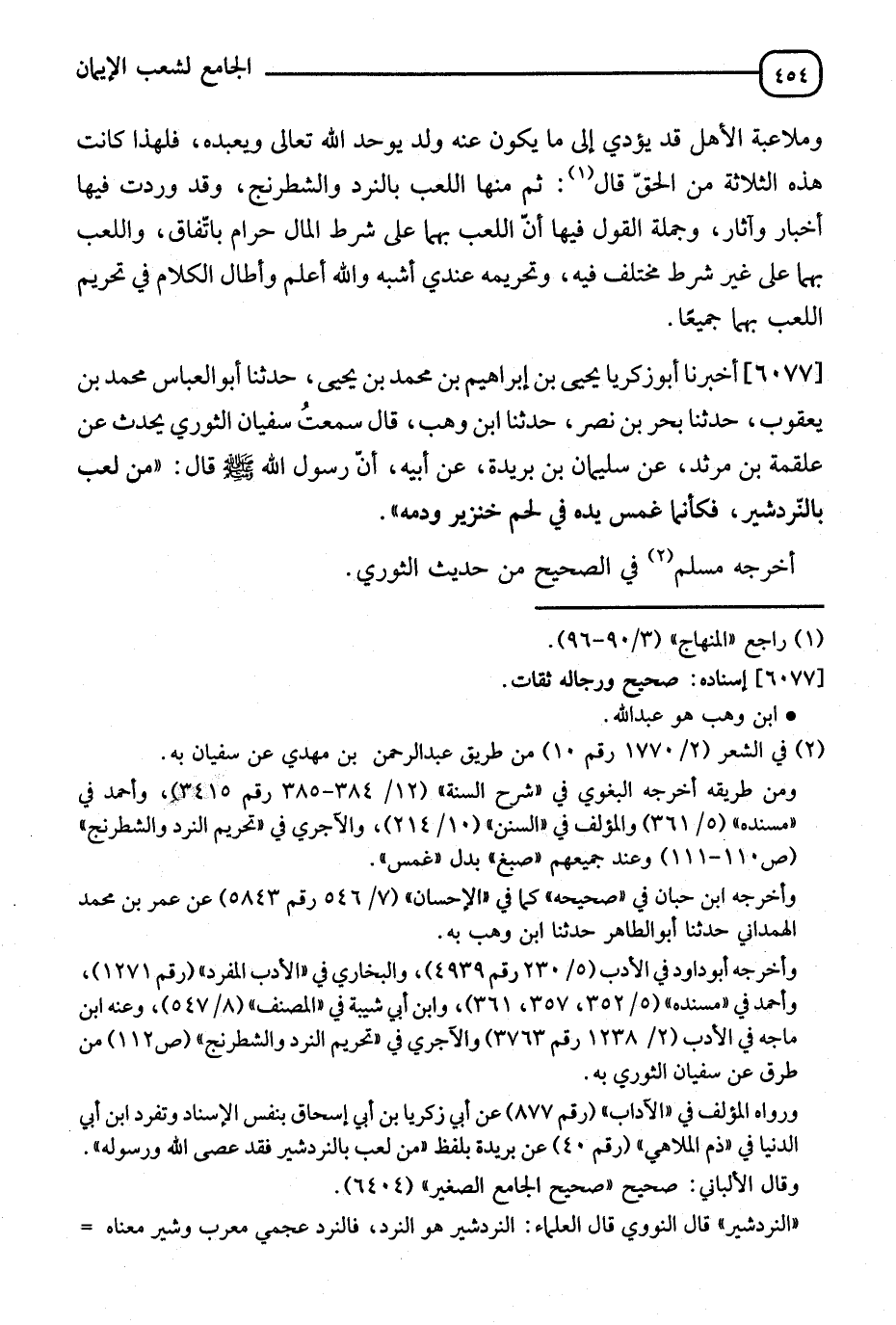 6077 - أَخْبَرَنَا أَبُو زَكَرِيَّا يَحْيَى بْنُ إِبْرَاهِيمَ بْنِ مُحَمَّدِ بْنِ يَحْيَى، ثَنَا أَبُو الْعَبَّاسِ مُحَمَّدُ بْنُ يَعْقُوبَ، ثَنَا بَحْرُ بْنُ نَصْرٍ، ثَنَا ابْنُ وَهْبٍ قَالَ: سَمِعْتُ سُفْيَانَ الثَّوْرِيَّ، يُحَدِّثُ عَنْ عَلْقَمَةَ بْنِ مَرْثَدٍ، عَنْ سُلَيْمَانَ بْنِ بُرَيْدَةَ، عَنْ أَبِيهِ: أَنَّ رَسُولَ اللهِ صَلَّى اللَّهُ عَلَيْهِ وَسَلَّمَ قَالَ: §" مَنْ لَعِبَ بِالنَّرْدَشِيرِ فَكَأَنَّمَا غَمَسَ يَدَهُ فِي لَحْمِ الْخِنْزِيرِ وَدَمِهِ " أَخْرَجَهُ مُسْلِمٌ فِي الصَّحِيحِ مِنْ حَدِيثِ الثَّوْرِيِّ. -[456]- قَالَ الْحَلِيمِيُّ رَحِمَهُ اللهُ: وَمَعْنَى قَوْلِهِ هَذَا عِنْدَ أَهْلِ الْعِلْمِ أَيْ كَمَنْ هُوَ غَمَسَ يَدَهُ فِي لَحْمِ الْخِنْزِيرِ بِهَيْئَتِهِ لِأَنْ يَأْكُلَ، وَالْجُمْلَةُ أَنَّ اللَّعِبَ بِالنَّرْدِ كَأَكْلِ لَحْمِ الْخِنْزِيرِ