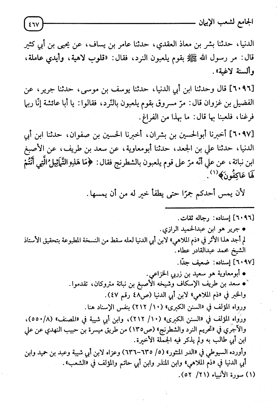 6097 - أَخْبَرَنَا أَبُو الْحُسَيْنِ بْنُ بِشْرَانَ، أَنَا الْحُسَيْنُ بْنُ صَفْوَانَ، ثَنَا ابْنُ أَبِي الدُّنْيَا، ثَنَا عَلِيُّ بْنُ الْجَعْدِ، ثَنَا أَبُو مُعَاوِيَةَ، عَنْ سَعْدِ بْنِ طَرِيفٍ، عَنِ الْأَصْبَغِ بْنِ نُبَاتَةَ، عَنْ عَلِيٍّ: أَنَّهُ مَرَّ عَلَى قَوْمٍ يَلْعَبُونَ بِالشِّطْرَنْجِ فَقَالَ: §" مَا هَذِهِ التَّمَاثِيلُ الَّتِي أَنْتُمْ لَهَا عَاكِفُونَ لَأَنْ يَمَسَّ جَمْرًا، حَتَّى تُطْفَأَ خَيْرٌ لَهُ مِنْ أَنْ يَمَسَّهَا " -[468]- قَالَ الشَّيْخُ: " وَلِهَذَا شَوَاهِدُ عَنْ عَلِيٍّ ذَكَرْنَاهَا فِي كِتَابِ الشَّهَادَاتِ "
