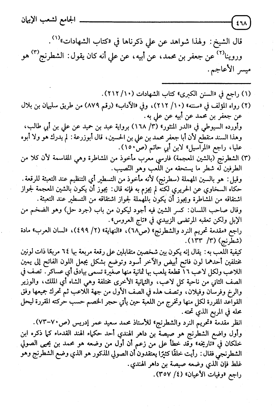 وَرُوِّينَا عَنْ جَعْفَرِ بْنِ مُحَمَّدٍ، عَنْ أَبِيهِ، عَنْ عَلِيٍّ أَنَّهُ كَانَ يَقُولُ: §" الشَّطْرَنْجُ هُوَ مَيْسِرُ الْأَعَاجِمِ " -[469]- وَرُوِّينَا عَنِ ابْنِ عُمَرَ أَنَّهُ سُئِلَ عَنِ الشَّطْرَنْجِ فَقَالَ: هِيَ شَرٌّ مِنَ النَّرْدِ، وَرُوِّينَا عَنِ ابْنِ شِهَابٍ أَنَّ أَبَا مُوسَى الْأَشْعَرِيَّ قَالَ: لَا يَلْعَبُ بِالشِّطْرَنْجِ إِلَّا خَاطِئٌ، وَعَنْ عُبَيْدِ اللهِ بْنِ أَبِي جَعْفَرٍ أَنَّ أَبَا سَعِيدٍ الْخُدْرِيَّ كَانَ يَكْرَهُ أَنْ يَلْعَبَ بِالشِّطْرَنْجِ، وَعَنِ ابْنِ شِهَابٍ أَنَّهُ سُئِلَ عَنْ لَعِبِ الشَّطْرَنْجِ، فَقَالَ: هِيَ مِنَ الْبَاطِلِ وَلَا يُحِبُّ اللهُ الْبَاطِلَ، وَرُوِّينَا مِثْلَ ذَلِكَ عَنِ ابْنِ الْمُسَيِّبِ، وَرُوِّينَا عَنْ مَالِكٍ أَنَّهُ قَالَ: الشَّطْرَنْجُ مِنَ النَّرْدِ، بَلَغَنَا عَنِ ابْنِ عَبَّاسٍ أَنَّهُ وَلِيَ مَالَ يَتِيمٍ فَأَحَرَقَهَا