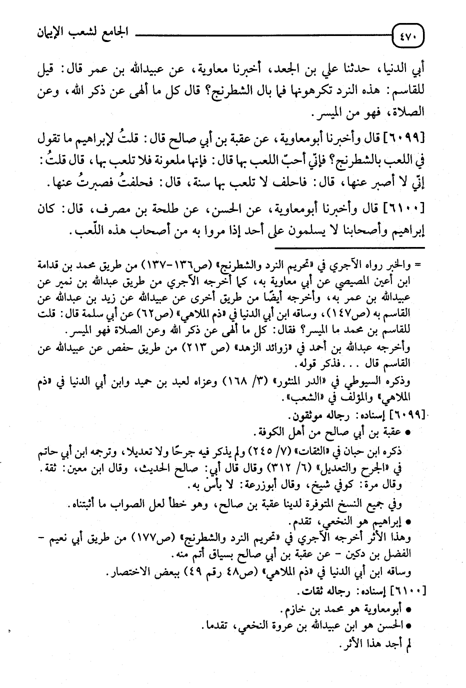 6099 - وَأَخْبَرَنَا أَبُو مُعَاوِيَةَ، عَنْ عُقْبَةَ بْنِ صَالِحٍ قَالَ: قُلْتُ لِإِبْرَاهِيمَ: مَا تَقُولُ فِي اللَّعِبِ بِالشِّطْرَنْجِ؟ فَإِنِّي أُحِبُّ اللَّعِبَ بِهَا قَالَ: " فَإِنَّهَا §مَلْعُونَةٌ فَلَا تَلْعَبْ بِهَا " قَالَ: قُلْتُ: إِنِّي لَا أَصْبِرُ عَنْهَا، قَالَ: " فَاحْلِفْ لَا تَلْعَبُ بِهَا سَنَةً " قَالَ: فَحَلَفْتُ فَصَبَرْتُ عَنْهَا قَالَ