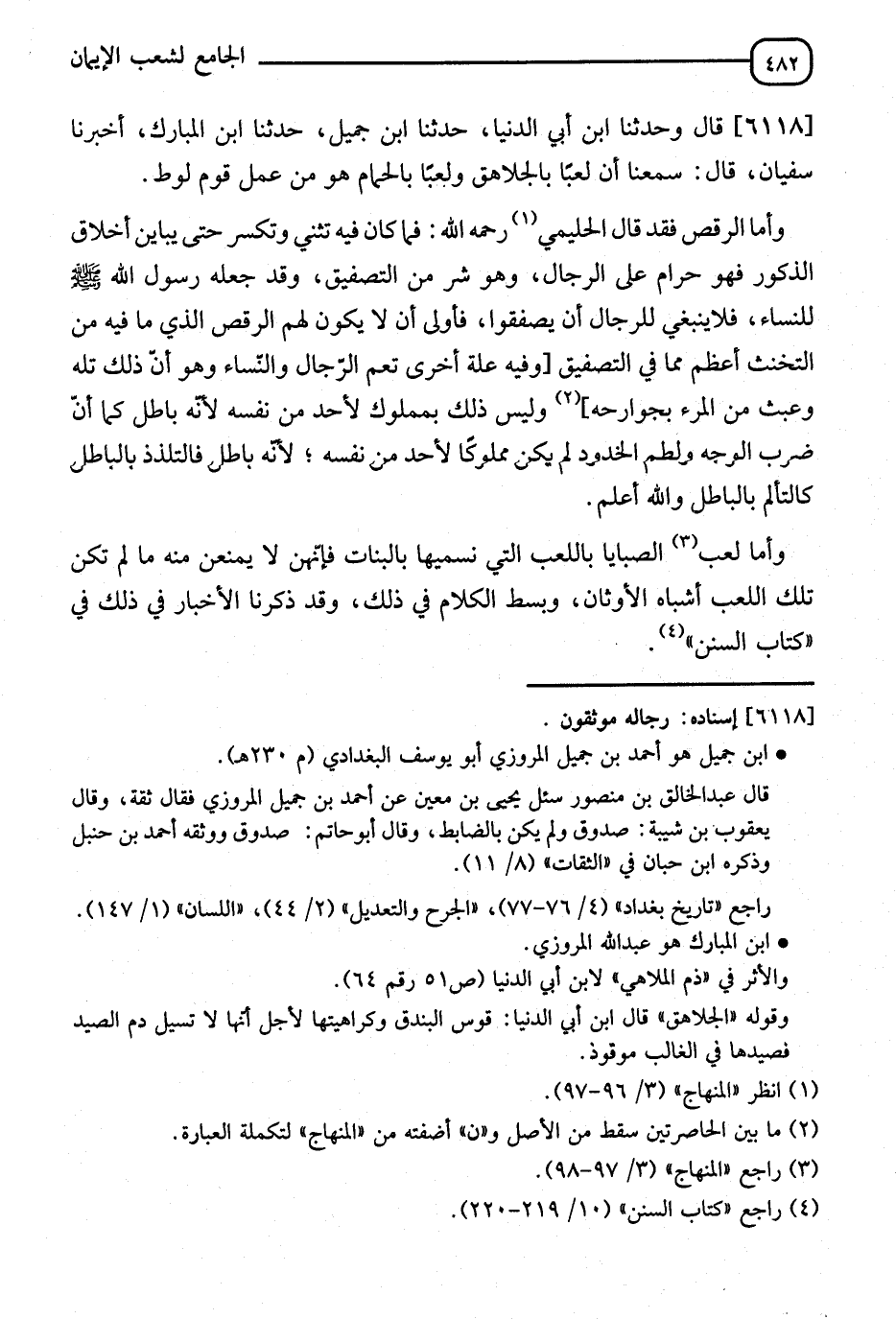 6118 - وَثَنَا ابْنُ أَبِي الدُّنْيَا، ثَنَا ابْنُ جَمِيلٍ، ثَنَا ابْنُ الْمُبَارَكِ، أَنَا سُفْيَانُ قَالَ: §" سَمِعْتُ أَنَّ لَعِبًا بالْجَلَاهِقِ وَلَعِبًا بِالْحَمَامِ هُوَ مِنْ عَمَلِ قَوْمِ لُوطٍ وَأَمَّا الرَّقْصُ " فَقَدْ قَالَ الْحَلِيمِيُّ رَحِمَهُ اللهُ: فَمَا كَانَ فِيهِ تَثَنٍّ وَتَكَسُّرٌ حَتَّى يُبَايِنَ أَخْلَاقَ الذُّكُورِ، فَهُوَ حَرَامٌ عَلَى الرِّجَالِ وَهُوَ شَرٌّ مِنَ التَّصْفِيقِ وَقَدْ جَعَلَهُ رَسُولُ اللهِ صَلَّى اللَّهُ عَلَيْهِ وَسَلَّمَ لِلنِّسَاءِ، لَا يَنْبَغِي لِلرِّجَالِ أَنْ يُصَفِّقُوا فَأَوْلَى أَنْ لَا يَكُونَ لَهُمُ الرَّقْصُ الَّذِي فِيهِ مِنَ التَّخُنُّثِ أَعْظَمَ مِمَّا فِي التَّصْفِيقِ، وَلَيْسَ ذَلِكَ بِمَمْلُوكٍ لِأَحَدٍ مِنْ نَفْسِهِ لِأَنَّهُ بَاطِلٌ كَمَا أَنَّ ضَرْبَ الْوُجُوهِ، وَلَطْمَ الْخُدُودِ لَمْ يَكُنْ مَمْلُوكًا لِأَحَدٍ مِنْ نَفْسِهِ لِأَنَّهُ بَاطِلٌ، فَالتَّلُذُّذُ بِالْبَاطِلِ كَالتَّأَلُّمِ بِالْبَاطِلِ وَاللهُ أَعْلَمُ، وَأَمَّا لَعِبُ الصَّبَايَا بِاللَّعِبِ الَّتِي تُسَمِّيهَا الْبَنَاتُ فَإِنَّهُنَّ لَا يُمْنَعْنَ مِنْهُ مَا لَمْ تَكُنْ تِلْكَ اللُّعَبُ أَشْبَاهَ الْأَوْثَانِ. وَبَسَطَ الْكَلَامَ فِي ذَلِكَ وَقَدْ ذَكَرْنَا الْأَخْبَارَ فِي ذَلِكَ فِي كِتَابِ السُّنَنِ -[483]- قَالَ الْحَلِيمِيُّ رَحِمَهُ اللهُ: وَمَنْ وُجُوهِ اللَّعِبِ التَّحْرِيشُ بَيْنَ الْكِلَابِ وَالدُّيُوكِ، وَقَدْ جَاءَ عَنِ النَّبِيِّ صَلَّى اللَّهُ عَلَيْهِ وَسَلَّمَ أَنَّهُ نَهَى عَنْهُ التَّحْرِيشَ بَيْنَ الْبَهَائِمِ هُوَ حَرَامٌ مَمْنُوعٌ لَا يُؤْذَنُ لِأَحَدٍ فِيهِ؛ لِأَنَّ كُلَّ وَاحِدٍ مِنَ الْمُتَحَارِشَيْنِ يُؤْلِمُ الْآخَرَ، وَيَجْرَحُهُ وَلَوْ أَرَادَ الْمُحَرِّشُ أَنْ يَفْعَلَ ذَلِكَ بِيَدِهِ مَا حَلَّ لَهُ