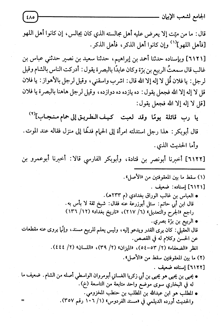 6121 - وَبِإِسْنَادِهِ ثَنَا أَحْمَدُ بْنُ إِبْرَاهِيمَ، ثَنَا سَعِيدُ بْنُ نُصَيْرٍ، حَدَّثَنِي عَامِرُ بْنُ غَالِبٍ قَالَ: سَمِعْتُ الرَّبِيعَ بْنَ مُرَّةَ، وَكَانَ عَابِدًا بِالْبَصْرَةِ، يَقُولُ: أَدْرَكْتُ النَّاسَ بِالشَّامِ وَقِيلَ لِرَجُلٍ يَا فُلَانُ: قُلْ لَا إِلَهَ إِلَّا اللهُ، قَالَ: اشْرَبْ وَاسْقِنِي. وَقِيلَ بِالْأَهْوَازِ: يَا فُلَانُ قُلْ لَا إِلَهَ إِلَّا اللهُ، فَجَعَلَ يَقُولُ: ده يا زده ده دوازده وَقِيلَ لِرَجُلٍ: هَهُنَا بِالْبَصْرَةِ يَا فُلَانُ قُلْ لَا إِلَهَ إِلَّا اللهُ، فَجَعَلَ يَقُولُ: