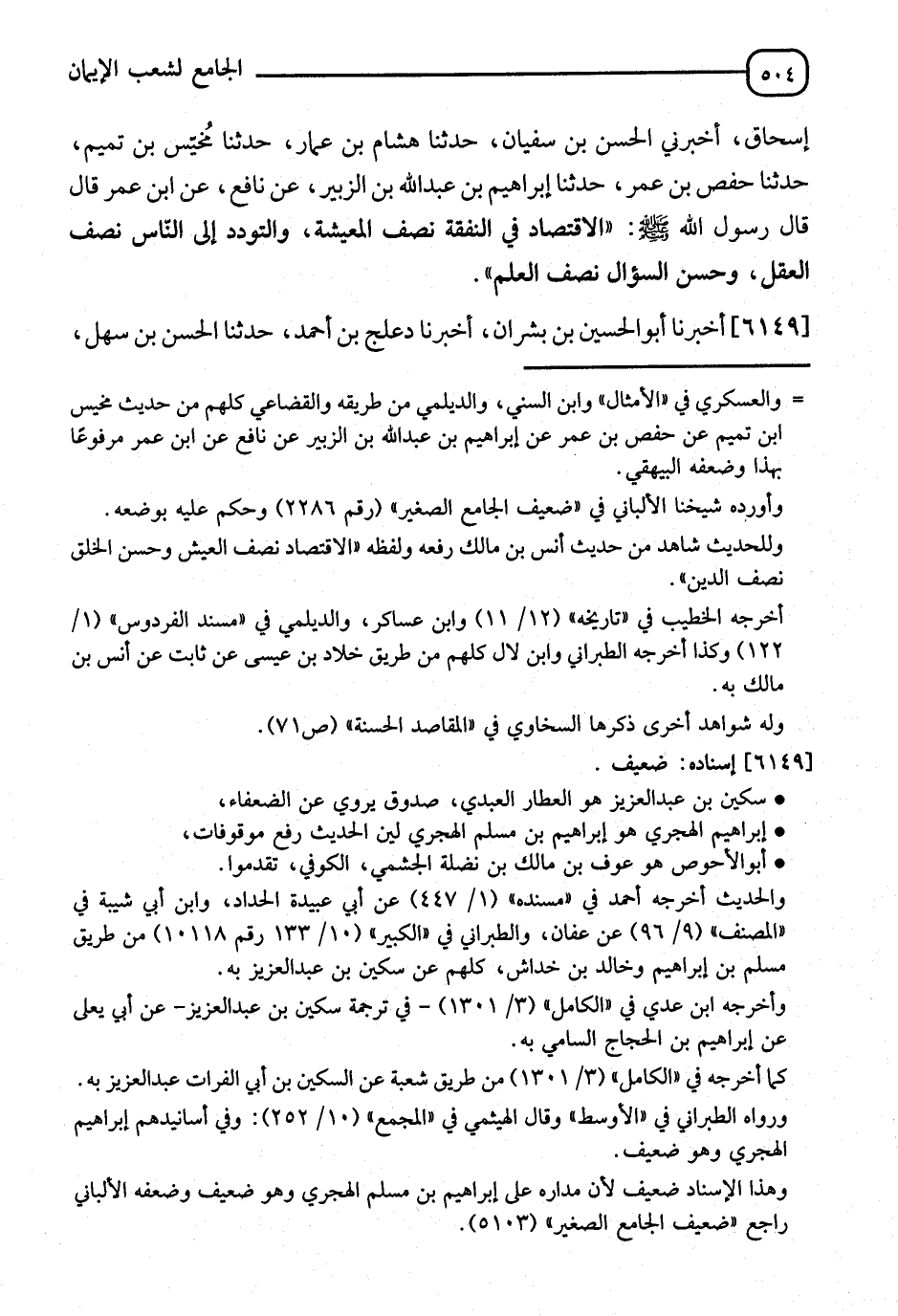 6149 - أَخْبَرَنَا أَبُو الْحُسَيْنِ بْنُ بِشْرَانَ، أَنَا دَعْلَجُ بْنُ أَحْمَدَ، ثَنَا الْحَسَنُ بْنُ سُهَيْلٍ، -[505]- ثَنَا إِبْرَاهِيمُ بْنُ الْحَجَّاجِ السَّامِيُّ، ثَنَا سُكَيْنُ بْنُ عَبْدِ الْعَزِيزِ، عَنْ إِبْرَاهِيمَ الْهَجَرِيِّ، عَنْ أَبِي الْأَحْوَصِ، عَنْ عَبْدِ اللهِ، قَالَ رَسُولُ اللهِ صَلَّى اللَّهُ عَلَيْهِ وَسَلَّمَ: " §مَا عَالَ مَنِ اقْتَصَدَ " وَرَوَاهُ عَفَّانُ بْنُ مُسْلِمٍ، عَنْ سُكَيْنِ وَزَادَ فِيهِ وَلَا يَبْقَى عَلَى سَرَفٍ كَثِيرٍ