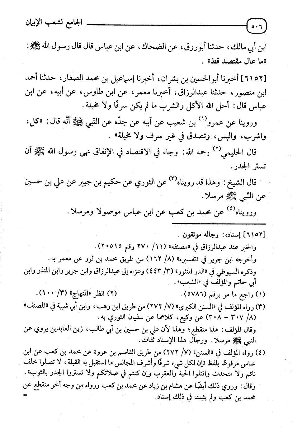 6152 - أَخْبَرَنَا أَبُو الْحُسَيْنِ بْنُ بِشْرَانَ، أَنَا إِسْمَاعِيلُ بْنُ مُحَمَّدٍ الصَّفَارُ، ثَنَا أَحْمَدُ بْنُ مَنْصُورٍ، ثَنَا عَبْدُ الرَّزَّاقِ، أَنَا مَعْمَرٌ، عَنِ ابْنِ طَاوُسٍ، عَنْ أَبِيهِ، عَنِ ابْنِ عَبَّاسٍ، قَالَ: §" أَحَلَّ اللهُ الْأَكْلَ وَالشُّرْبَ مَا لَمْ يَكُنْ سَرَفًا وَلَا مَخِيلَةً "