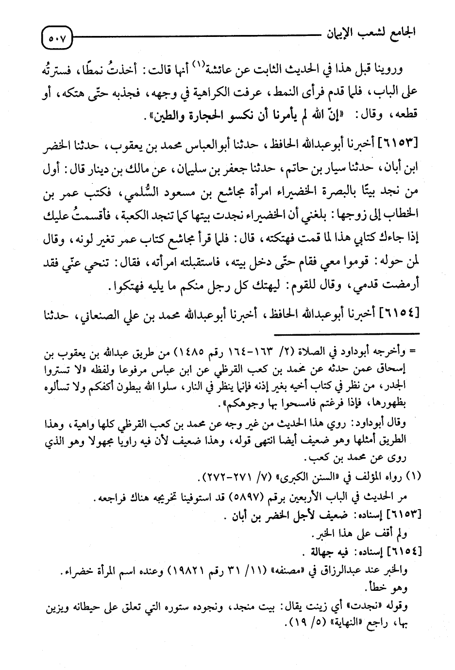 6153 - أَخْبَرَنَا أَبُو عَبْدِ اللهِ الْحَافِظُ، ثَنَا أَبُو الْعَبَّاسِ مُحَمَّدُ بْنُ يَعْقُوبَ، ثَنَا الْخَضِرُ بْنُ أَبَانَ، ثَنَا سَيَّارُ بْنُ حَاتِمٍ، ثَنَا جَعْفَرُ بْنُ سُلَيْمَانَ، عَنْ مَالِكِ بْنِ دِينَارٍ، قَالَ: أَوَّلُ مَنْ نَجَّدَ بَيْتًا بِالْبَصْرَةِ الْخُضَيْرَاءُ امْرَأَةُ مُجَاشِعِ بْنِ مَسْعُودٍ السَّلَمِيِّ، فَكَتَبَ عُمَرُ بْنُ الْخَطَّابِ إِلَى زَوْجِهَا: " §بَلَغَنِي أَنَّ الْخُضَيْرَاءَ نَجَّدَتْ بَيْتَهَا كَمَا تُنَجَّدُ الْكَعْبَةُ، فَأَقْسَمْتُ عَلَيْكَ إِذَا جَاءَكَ كِتَابِي هَذَا لَمَا قُمْتَ فَهَتَكْتَهُ "، قَالَ: فَلَمَّا قَرَأَ مُجَاشِعٌ كِتَابَ عُمَرَ تَغَيَّرَ لَوْنُهُ وَقَالَ لِمَنْ حَوْلَهُ: قُومُوا مَعِي فَقَامَ حَتَّى دَخَلَ بَيْتَهُ فَاسْتَقْبَلَتْهُ امْرَأَتُهُ، فَقَالَ: تَنَحِّي عَنِّي فَقَدْ أَرْمَضْتِ قَدَمِي، وَقَالَ لِلْقَوْمِ: لِيَهْتِكَ كُلُّ رَجُلٍ مِنْكُمْ مَا يَلِيهِ فَهَتَكُوا
