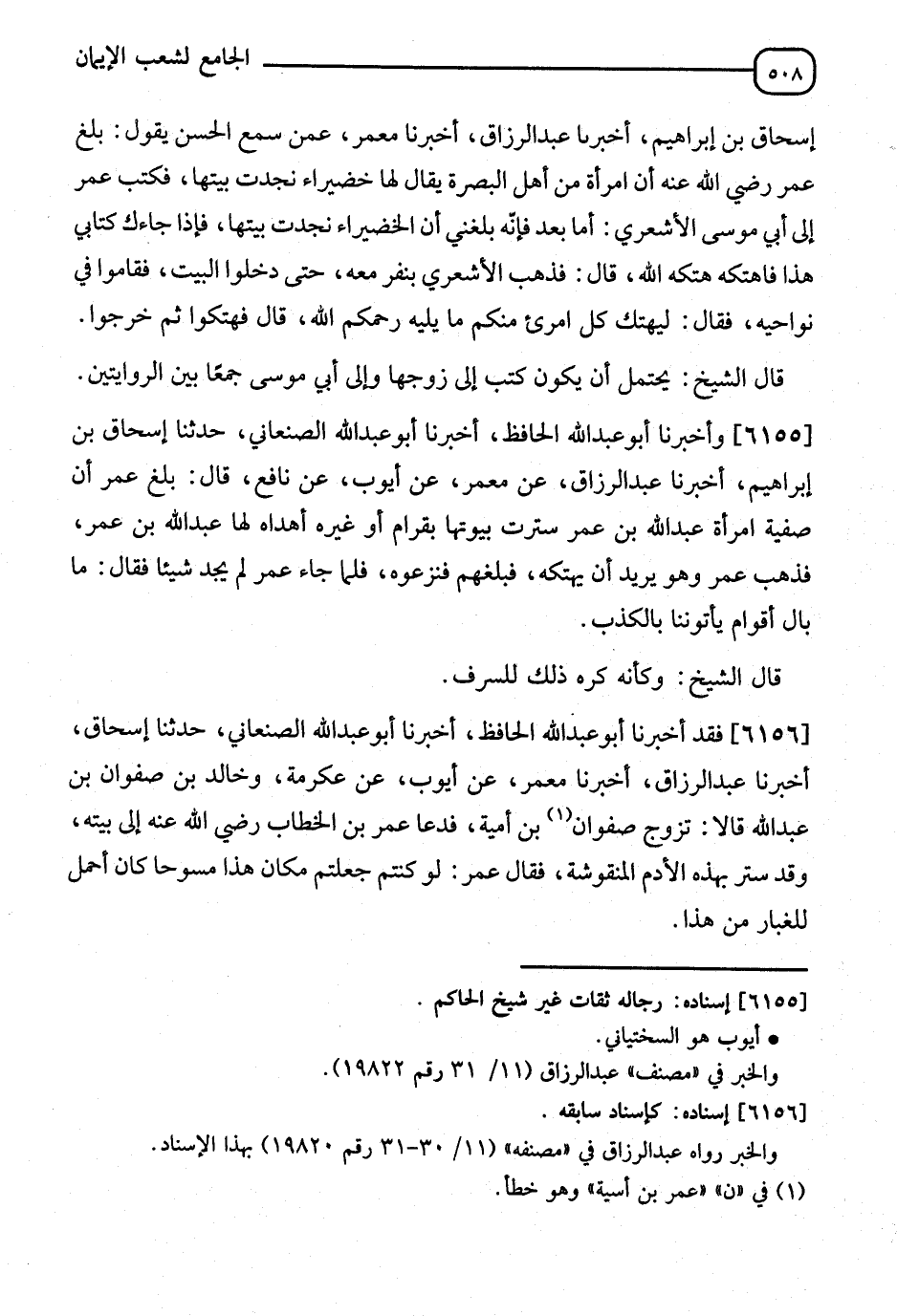 6156 - فَقَدْ أَخْبَرَنَا أَبُو عَبْدِ اللهِ الْحَافِظُ، أَنَا أَبُو عَبْدِ اللهِ الصَّنْعَانِيُّ، ثَنَا إِسْحَاقُ، أَنَا عَبْدُ الرَّزَّاقِ، أَنَا مَعْمَرٌ، عَنْ أَيُّوبَ، عَنْ عِكْرِمَةَ، وَخَالِدِ بْنِ صَفْوَانَ بْنِ عَبْدِ اللهِ، قَالَا: تَزَوَّجَ صَفْوَانُ بْنُ أُمَيَّةَ فَدَعَا عُمَرَ بْنَ الْخَطَّابِ رَضِيَ اللهُ عَنْهُ إِلَى بَيْتِهِ وَقَدْ سَتَرَ بِهَذِهِ الْأُدُمُ الْمَنْقُوشَةِ، فَقَالَ عُمَرُ: §" لَوْ كُنْتُمْ جَعَلْتُمْ مَكَانَ هَذَا مُسُوحًا كَانَ أَحْمَلَ لِلْغُبَارِ مِنْ هَذَا "