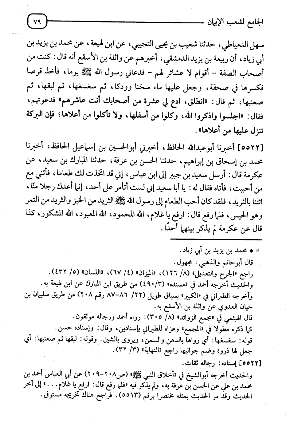 5522 - أَخْبَرَنَا أَبُو عَبْدِ اللهِ الْحَافِظُ، أَخْبَرَنِي أَبُو الْحُسَيْنِ بْنُ إِسْمَاعِيلَ الْحَافِظُ، أَنَا مُحَمَّدُ بْنُ إِسْحَاقَ بْنِ إِبْرَاهِيمَ، ثَنَا الْحَسَنُ بْنُ عَرَفَةَ، ثَنَا الْمُبَارَكُ بْنُ سَعِيدٍ، عَنْ عِكْرِمَةَ قَالَ: أَرْسَلَ سَعِيدُ بْنُ جُبَيْرٍ إِلَى ابْنِ عَبَّاسٍ: إِنِّي قَدِ اتَّخَذْتُ لَكَ طَعَامًا، فَأْتِنِي مَعَ مَنْ أَحْبَبْتَ، فَأَتَاهُ فَقَالَ لَهُ: " يَا أَبَا سَعِيدٍ، §إِنِّي لَسْتُ أَتَأَمَّرُ عَلَى أَحَدٍ، إِنَّمَا أَعُدُّكَ رَجُلًا مِنَّا ائْتِنَا بِالثَّرِيدِ، فَلَقَدْ كَانَ أَحَبُّ الطَّعَامِ إِلَى رَسُولِ اللهِ، الثَّرِيدَ مِنَ الْخُبْزِ، وَالثَّرِيدَ مِنَ التَّمْرِ، وَهُوَ الْحَيْسُ، فَلَمَّا رَفَعَ قَالَ: ارْفَعْ يَا غُلَامُ اللهُ الْمَحْمُودُ، اللهُ الْمَعْبُودُ الْمَشْكُورُ " كَذَا قَالَ عَنْ عِكْرِمَةَ، لَمْ يُذْكَرْ بَيْنَهُمَا أَحَدٌ