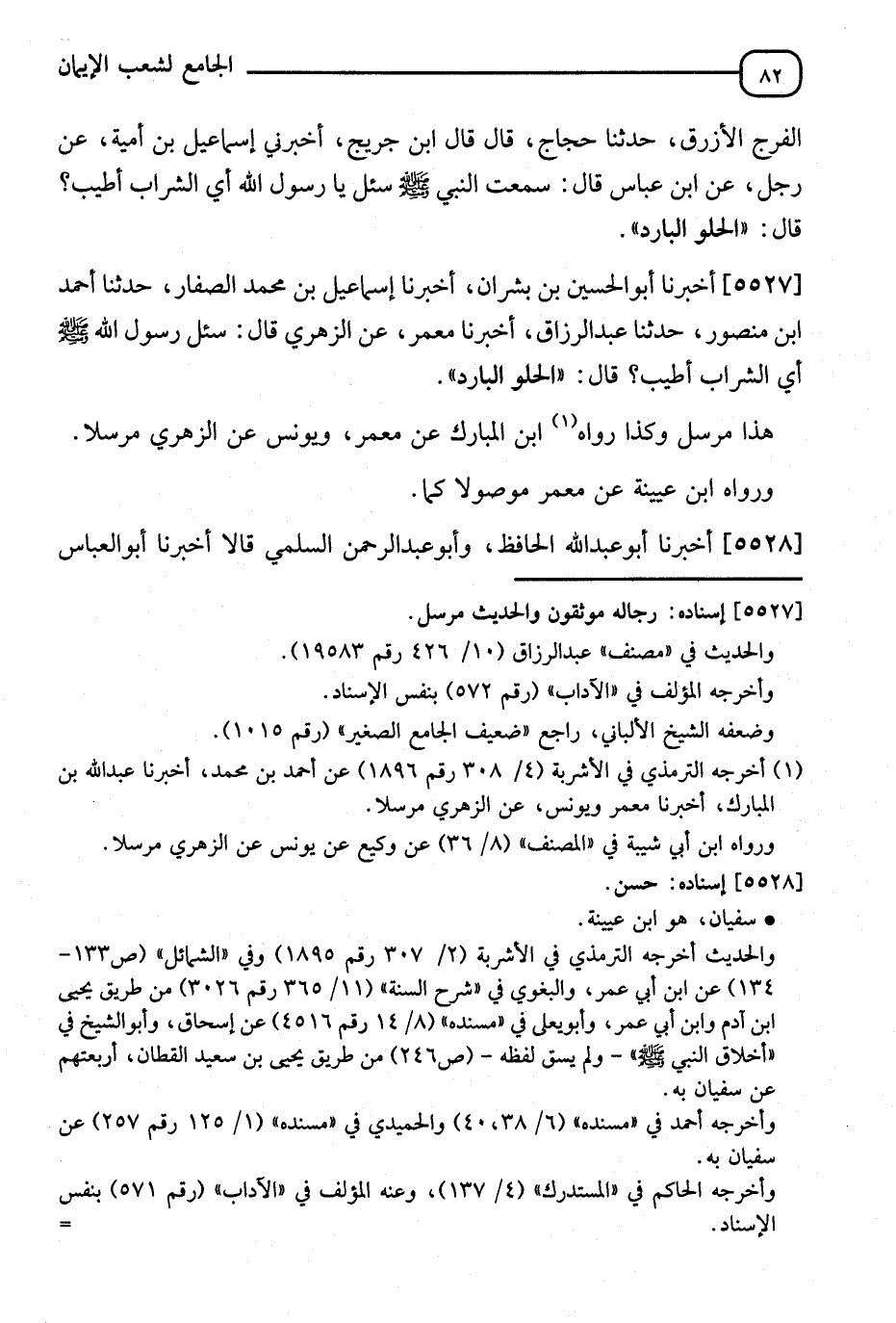 5528 - كَمَا أَخْبَرَنَا أَبُو عَبْدِ اللهِ الْحَافِظُ، وَأَبُو عَبْدِ الرَّحْمَنِ السَّلَمِيُّ، قَالَا: أَنَا أَبُو الْعَبَّاسِ -[83]- مُحَمَّدُ بْنُ يَعْقُوبَ، ثَنَا أَحْمَدُ بْنُ شَيْبَانَ، ثَنَا سُفْيَانُ، عَنْ مَعْمَرٍ، عَنِ الزُّهْرِيِّ، عَنْ عُرْوَةَ، عَنْ عَائِشَةَ قَالَتْ: " §أَحَبُّ الشَّرَابِ إِلَى رَسُولِ اللهِ صَلَّى اللَّهُ عَلَيْهِ وَسَلَّمَ، الْحُلْوُ الْبَارِدُ " وَكَذَلِكَ رَوَاهُ جَمَاعَةٌ عَنِ ابْنِ عُيَيْنَةَ، وَالْأَوَّلُ أَصَحُّ، وَرَوَاهُ زَمْعَةُ بْنُ صَالِحٍ، عَنِ الزُّهْرِيِّ، عَنِ ابْنِ الْمُسَيِّبِ، عَنْ أَبِي هُرَيْرَةَ، وَلَيْسَ بِمَحْفُوظٍ