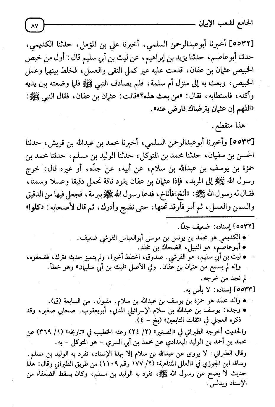 5532 - أَخْبَرَنَا أَبُو عَبْدِ الرَّحْمَنِ السَّلَمِيُّ، أَنَا عَلِيُّ بْنُ الْمُؤَمَّلِ، ثَنَا الْكُدَيْمِيُّ، ثَنَا أَبُو عَاصِمٍ، ثَنَا يَزِيدُ بْنُ إِبْرَاهِيمَ، عَنْ لَيْثِ بْنِ أَبِي سُلَيْمَانَ قَالَ: أَوَّلُ مَنْ خَبَصَ الْخَبِيصَ، عُثْمَانُ بْنُ عَفَّانَ، قَدِمْتُ عَلَيْهِ غَيْرَ كَمِلِ النَّقِيِّ وَالْعَسَلِ، فَخَلَطَ بَيْنَهُمَا وَعَمِلَ الْخَبِيصَ، وَبَعَثَ بِهِ إِلَى مَنْزِلِ أُمِّ سَلَمَةَ، فَلَمْ يُصَادِفِ النَّبِيَّ صَلَّى اللَّهُ عَلَيْهِ وَسَلَّمَ، فَلَمَّا وَضَعْتُهُ بَيْنَ يَدَيْهِ وَأَكْلَهُ، فَاسْتَطَابَهُ، فَقَالَ: " مَنْ بَعَثَ هَذِهِ؟ " قَالَتْ: عُثْمَانُ بْنُ عَفَّانَ فَقَالَ النَّبِيُّ صَلَّى اللَّهُ عَلَيْهِ وَسَلَّمَ: §" اللهُمَّ إِنَّ عُثْمَانَ يَتَرَضَّاكَ فَارْضَ عَنْهُ " هَذَا مُنْقَطِعٌ