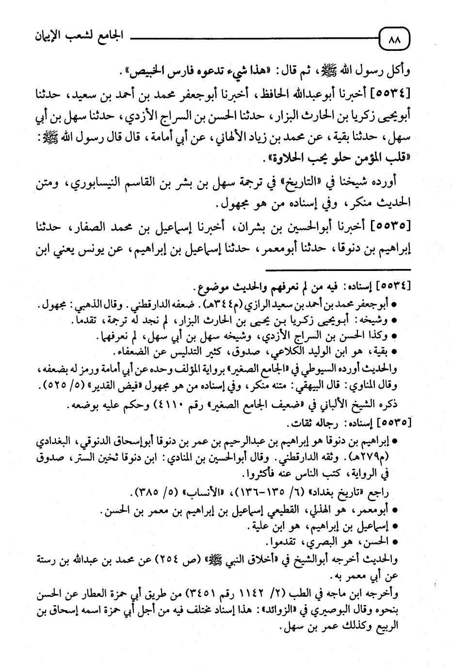 5534 - أَخْبَرَنَا أَبُو عَبْدِ اللهِ الْحَافِظُ، أَنَا أَبُو جَعْفَرٍ مُحَمَّدُ بْنُ أَحْمَدَ بْنِ سَعِيدٍ، ثَنَا أَبُو يَحْيَى زَكَرِيَّا بْنُ الْحَارِثِ الْبَزَّارُ، ثَنَا الْحَسَنُ بْنُ السَّرَّاجِ الْأَزْدِيُّ، ثَنَا سُهَيْلُ بْنُ أَبِي سَهْلٍ، ثَنَا بَقِيَّةُ، عَنْ مُحَمَّدِ بْنِ زِيَادٍ الْأَلْهَانِيُّ، عَنْ أَبِي أُمَامَةَ قَالَ: قَالَ رَسُولُ اللهِ صَلَّى اللَّهُ عَلَيْهِ وَسَلَّمَ: " §قَلْبُ الْمُؤْمِنِ حُلْوٌ، يُحِبُّ الْحَلَاوَةَ " " أَوْرَدَهُ شَيْخُنَا فِي التَّارِيخِ فِي تَرْجَمَةِ سَهْلِ بْنِ بِشْرِ بْنِ الْقَاسِمِ النَّيْسَابُورِيِّ، وَمَتْنُ الْحَدِيثِ مُنْكَرٌ، وَفِي إِسْنَادِهِ مَنْ هُوَ مَجْهُولٌ "