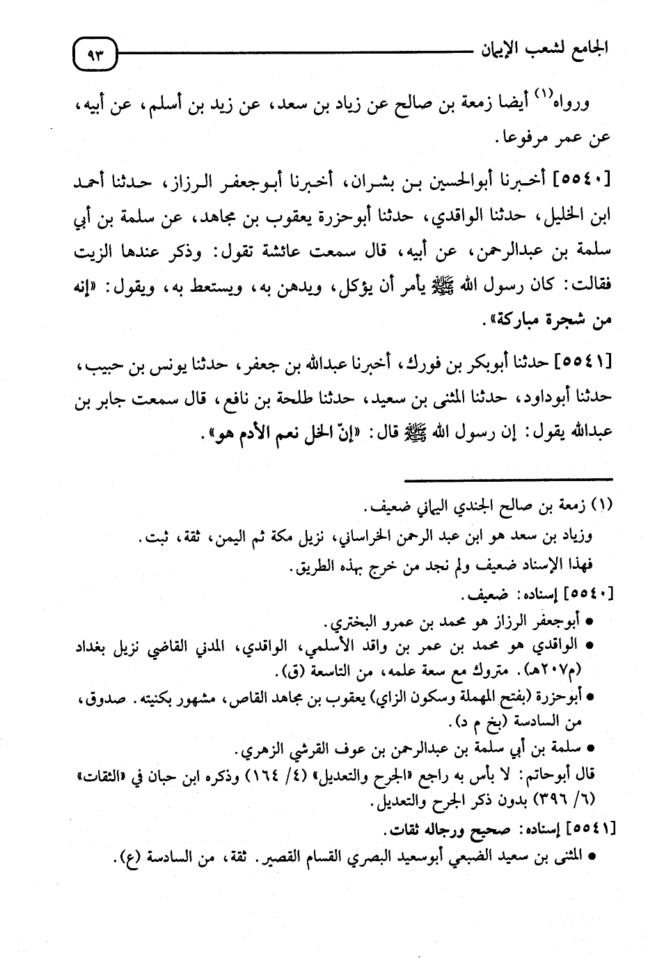 5540 - أَخْبَرَنَا أَبُو الْحُسَيْنِ بْنُ بِشْرَانَ، أَنَا أَبُو جَعْفَرٍ الرَّزَّازُ، ثَنَا أَحْمَدُ بْنُ الْخَلِيلِ، ثَنَا الْوَاقِدِيُّ، ثَنَا أَبُو حَزْرَةَ يَعْقُوبُ بْنُ مُجَاهِدٍ، عَنْ سَلَمَةَ بْنِ أَبِي سَلَمَةَ بْنِ عَبْدِ الرَّحْمَنِ، عَنْ أَبِيهِ قَالَ: سَمِعْتُ عَائِشَةَ تَقُولُ: وَذُكِرَ عِنْدَهَا الزَّيْتُ، فَقَالَتْ: كَانَ رَسُولُ اللهِ صَلَّى اللَّهُ عَلَيْهِ وَسَلَّمَ يَأْمُرُ أَنْ يُؤْكَلَ وَيُدَّهَنَ وَيُتَسَعَّطَ بِهِ وَيَقُولُ: §" إِنَّهُ مِنْ شَجَرَةٍ مُبَارَكَةٍ "