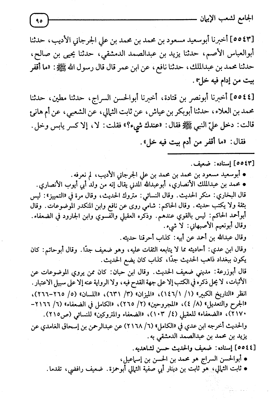 5543 - أَخْبَرَنَا أَبُو سَعِيدٍ مَسْعُودٌ، عَنْ مُحَمَّدِ بْنِ عَلِيٍّ الْجُرْجَانِيِّ الْأَدِيبِ، ثَنَا أَبُو الْعَبَّاسِ الْأَصَمُّ، ثَنَا يَزِيدُ بْنُ عَبْدِ الصَّمَدِ الدِّمَشْقِيُّ، ثَنَا يَحْيَى بْنُ صَالِحٍ، ثَنَا مُحَمَّدُ بْنُ عَبْدِ الْمَلِكِ، ثَنَا نَافِعٌ، عَنِ ابْنِ عُمَرَ قَالَ: قَالَ رَسُولُ اللهِ صَلَّى اللَّهُ عَلَيْهِ وَسَلَّمَ: " §مَا أَقْفَرَ بَيْتٌ، فِيهِ خَلٌّ "