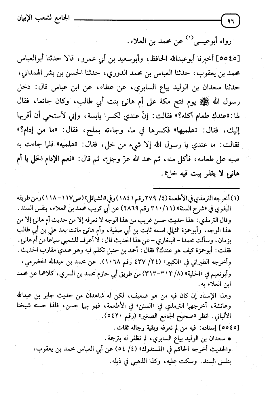 5545 - أَخْبَرَنَا أَبُو عَبْدِ اللهِ الْحَافِظُ، وَأَبُو سَعِيدِ بْنُ أَبِي عَمْرٍو قَالَا: ثَنَا أَبُو الْعَبَّاسِ مُحَمَّدُ بْنُ يَعْقُوبَ، ثَنَا الْعَبَّاسُ بْنُ مُحَمَّدٍ الدُّورِيُّ، ثَنَا الْحَسَنُ بْنُ بِشْرٍ الْهَمْدَانِيُّ، ثَنَا سَعْدَانُ بْنُ الْوَلِيدِ، بَيَّاعُ السَّابِرِيِّ، عَنْ عَطَاءٍ، عَنِ ابْنِ عَبَّاسٍ قَالَ: دَخَلَ رَسُولُ اللهِ صَلَّى اللَّهُ عَلَيْهِ وَسَلَّمَ يَوْمَ فَتْحِ مَكَّةَ، عَلَى أُمِّ هَانِئٍ بِنْتِ أَبِي طَالِبٍ، وَكَانَ جَائِعًا فَقَالَ لَهَا: " عِنْدِكِ طَعَامٌ آكُلُهُ؟ " فَقَالَتْ: إِنَّ عِنْدِي لَكِسَرًا يَابِسَةٌ، وَإِنِّي لَأَسْتَحِي أَنْ أُقَرِّبَهَا إِلَيْكَ، فَقَالَ: " هَلُمِّيهَا " فَكَسَّرَهَا فِي مَاءٍ، وَجَاءَتْهُ بِمِلْحٍ فَقَالَ: " مَا مِنْ إِدَامٍ؟ " فَقَالَتْ: مَا عِنْدِي يَا رَسُولَ اللهِ إِلَّا شَيْءٌ مِنْ خَلٍّ فَقَالَ: " هُلُمِّيهِ " فَلَمَّا جَاءَتْ بِهِ صَبَّهُ عَلَى طَعَامِهِ، فَأَكَلَ مِنْهُ، ثُمَّ حَمِدَ اللهَ عَزَّ وَجَلَّ، ثُمَّ قَالَ: " §نِعْمَ الْإِدَامُ الْخَلُّ يَا أُمَّ هَانِئٍ، لَا يَفْقَرُ بَيْتٌ فِيهِ خَلٌّ "