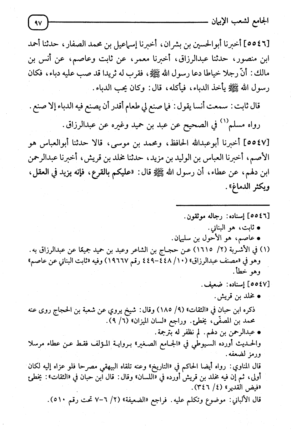 5546 - أَخْبَرَنَا أَبُو الْحُسَيْنِ بْنُ بِشْرَانَ، أَنَا إِسْمَاعِيلُ بْنُ مُحَمَّدٍ الصَّفَارُ، ثَنَا أَحْمَدُ بْنُ مَنْصُورٍ، ثَنَا عَبْدُ الرَّزَّاقِ، أَنَا مَعْمَرٌ، عَنْ ثَابِتٍ، وَعَاصِمٍ، عَنْ أَنَسِ بْنِ مَالِكٍ: أَنَّ رَجُلًا خَيَّاطًا، دَعَا رَسُولَ اللهِ صَلَّى اللَّهُ عَلَيْهِ وَسَلَّمَ فَقَرَّبَ لَهُ ثَرِيدًا قَدْ صَبَّ عَلَيْهِ دُبَّاءَ فَأَخَذَ رَسُولُ اللهِ صَلَّى اللَّهُ عَلَيْهِ وَسَلَّمَ الدُّبَّاءَ فَأَكَلَهُ قَالَ: §وَكَانَ يُحِبُّ الدُّبَّاءَ " قَالَ ثَابِتٌ: سَمِعْتُ أَنَسًا، يَقُولُ: فَمَا صُنِعَ لِي طَعَامٌ أَقْدِرُ أَنْ يُصْنَعَ فِيهِ دُبَّاءٌ، إِلَّا صُنِعَ رَوَاهُ مُسْلِمٌ فِي الصَّحِيحِ، عَنْ عَبْدِ بْنِ حُمَيْدٍ وَغَيْرُهُ عَنْ عَبْدِ الرَّزَّاقِ