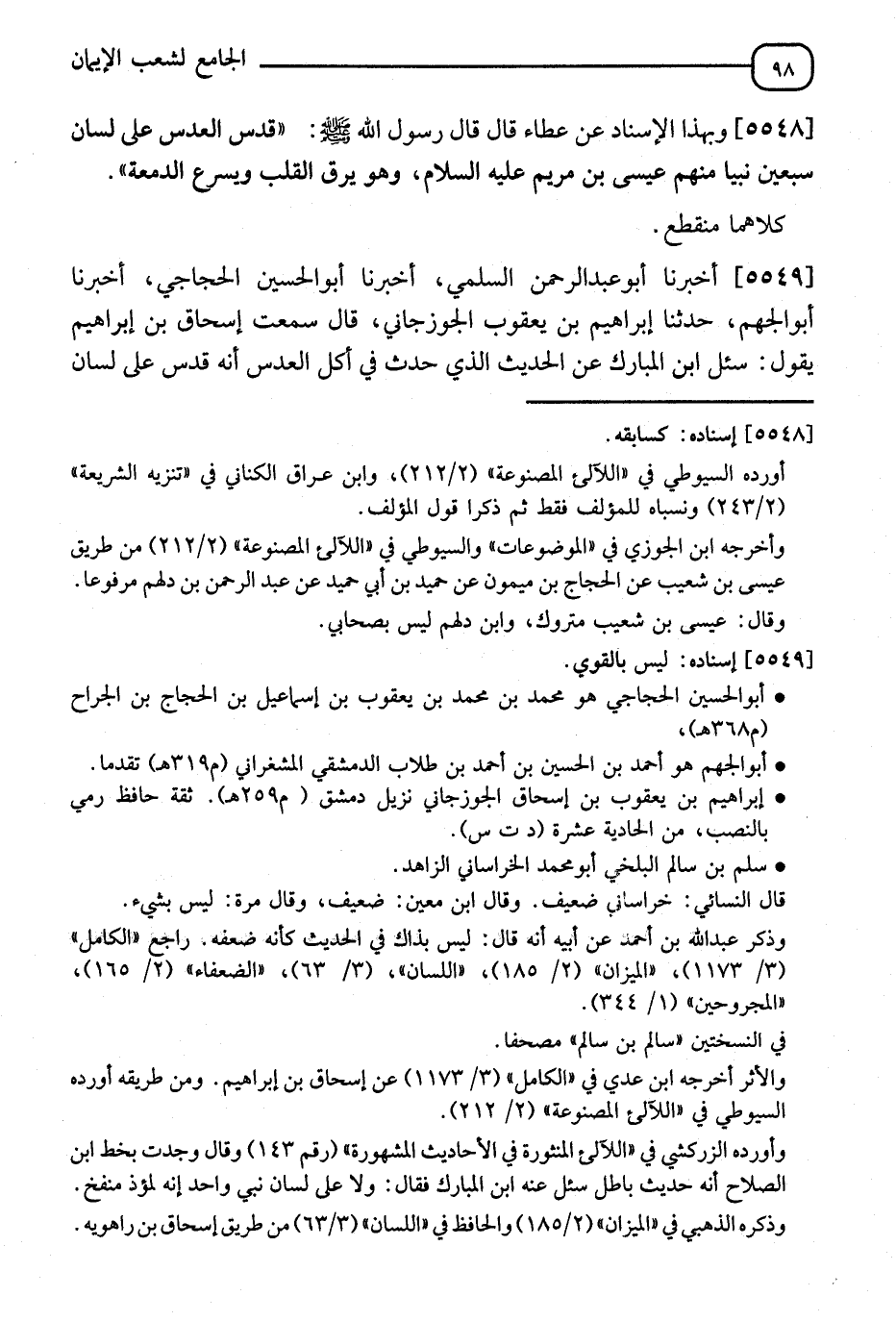 5549 - أَخْبَرَنَا أَبُو عَبْدِ الرَّحْمَنِ السَّلَمِيُّ، ثَنَا أَبُو الْحُسَيْنِ الْجُمَاجِيُّ، أَنَا أَبُو الْجَهْمِ، ثَنَا إِبْرَاهِيمُ بْنُ يَعْقُوبَ الْجَوْزَجَانِيُّ قَالَ: سَمِعْتُ إِسْحَاقَ بْنَ إِبْرَاهِيمَ يَقُولُ: سُئِلَ ابْنُ الْمُبَارَكِ عَنِ الْحَدِيثِ الَّذِي حَدَّثَ فِي أَكْلِ الْعَدَسِ أَنَّهُ قُدِّسَ عَلَى لِسَانِ -[99]- سَبْعِينَ نَبِيًّا؟ وَقَالَ: " §وَلَا عَلَى لِسَانِ نَبِيٍّ وَاحِدٍ، وَإِنَّهُ لَمُؤَذِّنٌ مُنَفِّخٌ " مَنْ يُحَدِّثُكُمْ بِهِ قَالَ: سَالِمُ بْنُ سَالِمٍ قَالُوا: عَمَّنْ؟ قَالُوا: عَنْكَ قَالَ: وَعَنِّي أَيْضًا