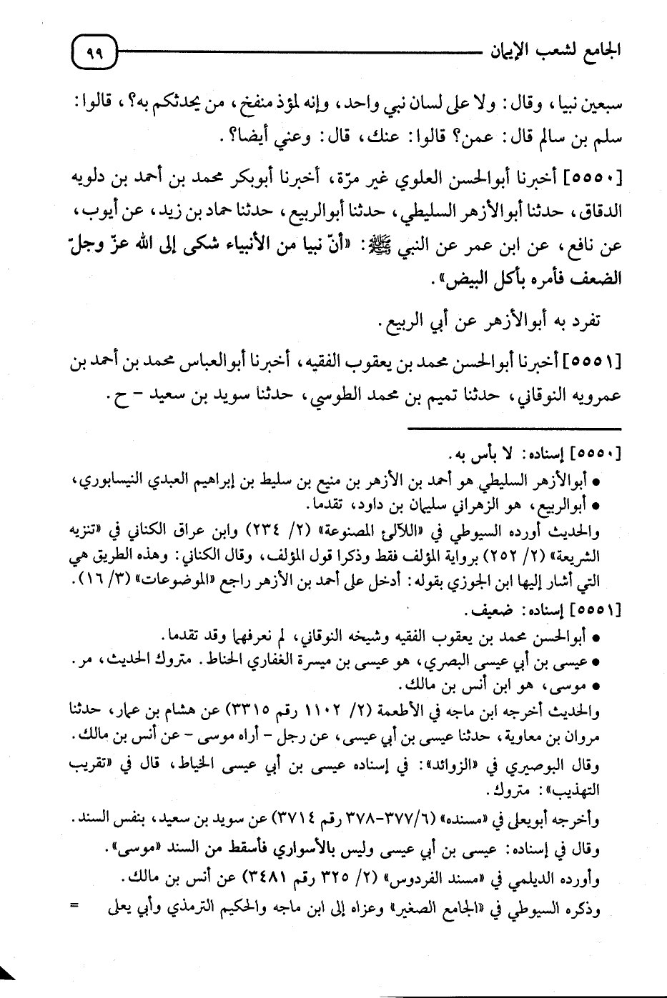 5550 - أَخْبَرَنَا أَبُو الْحَسَنِ الْعَلَوِيُّ غَيْرَ مَرَّةٍ، أَنَا أَبُو بَكْرٍ مُحَمَّدُ بْنُ أَحْمَدَ بْنِ دَلُّوَيْهِ الدَّقَّاقُ، ثَنَا أَبُو الْأَزْهَرِ السَّلِيطِيُّ، ثَنَا أَبُو الرَّبِيعِ، ثَنَا حَمَّادُ بْنُ زَيْدٍ، عَنْ أَيُّوبَ، عَنْ نَافِعٍ، عَنِ ابْنِ عُمَرَ عَنِ النَّبِيِّ صَلَّى اللَّهُ عَلَيْهِ وَسَلَّمَ: " §أَنَّ نَبِيًّا مِنَ الْأَنْبِيَاءِ، شَكَا إِلَى اللهِ عَزَّ وَجَلَّ الضَّعْفَ، فَأَمَرَهُ بِأَكْلِ الْبَيْضِ " " تَفَرَّدَ بِهِ أَبُو الْأَزْهَرِ، عَنْ أَبِي الرَّبِيعِ "