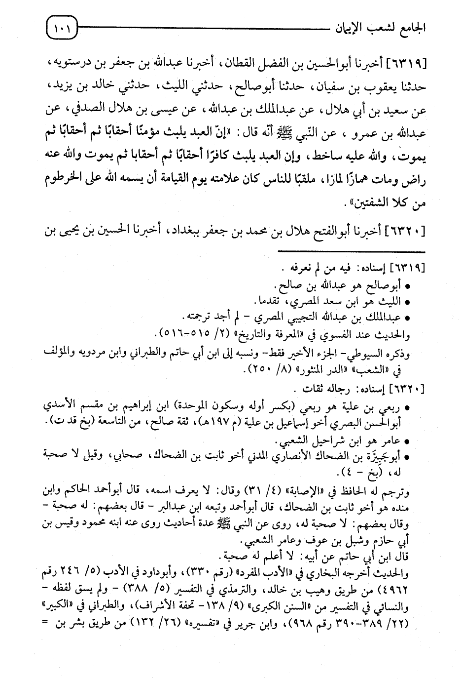 6319 - أَخْبَرَنَا أَبُو الْحُسَيْنِ بْنُ الْفَضْلِ الْقَطَّانُ، أَنَا عَبْدُ اللهِ بْنُ جَعْفَرِ بْنِ درستويهِ، نا يَعْقُوبُ بْنُ سُفْيَانَ، نا أَبُو صَالِحٍ، حَدَّثَنِي اللَّيْثُ، حَدَّثَنِي خَالِدُ بْنُ يَزِيدَ، عَنْ سَعِيدِ بْنِ أَبِي هِلَالٍ، عَنْ عَبْدِ الْمَلِكِ بْنِ عَبْدِ اللهِ، عَنْ عِيسَى بْنِ هِلَالٍ الصَّدَفِيِّ، عَنْ عَبْدِ اللهِ بْنِ عَمْرٍو، عَنِ النَّبِيِّ صَلَّى اللَّهُ عَلَيْهِ وَسَلَّمَ، أَنَّهُ قَالَ: " إِنَّ §الْعَبْدَ يَلْبَثُ مُؤْمِنًا أَحْقَابًا، ثُمَّ أَحْقَابًا، ثُمَّ يَمُوتُ وَاللهُ عَلَيْهِ سَاخِطٌ، وَإِنَّ الْعَبْدَ يَلْبَثُ أَحْقَابًا، ثُمَّ أَحْقَابًا، ثُمَّ يَمُوتُ وَاللهُ عَنْهُ رَاضٍ، وَمَنْ مَاتَ هَمَّازًا لَمَّازًا لِلنَّاسِ كَانَ عَلَامَتُهُ يَوْمَ الْقِيَامَةِ أَنْ يَسِمَهُ اللهُ عَلَى الْخُرْطُومِ مِنْ عَلَى الشَّفَتَيْنِ "
