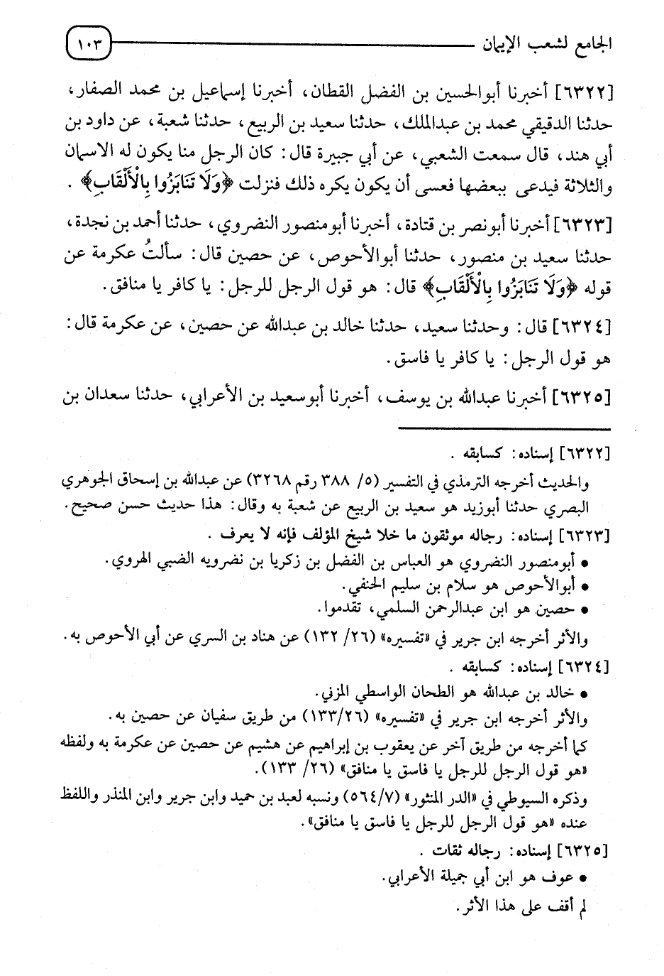 6325 - أَخْبَرَنَا عَبْدُ اللهِ بْنُ يُوسُفَ، أَنَا أَبُو سَعِيدِ بْنُ الْأَعْرَابِيِّ، نا سَعْدَانُ بْنُ -[104]- نَصْرٍ، نا إِسْحَاقُ بْنُ يُوسُفَ، نا عَوْفٌ، عَنْ أَبِي الْعَالِيَةِ، فِي قَوْلِ اللهِ عَزَّ وَجَلَّ: {§وَلَا تَنَابَزُوا بِالْأَلْقَابِ} [الحجرات: 11]، فَقَالَ: " لَا تَقُلْ لِمُسْلِمٍ يَا فَاسِقُ، وَتَلَا هَذِهِ الْآيَةَ: {بِئْسَ الِاسْمُ الْفُسُوقُ بَعْدَ الْإِيمَانِ} [الحجرات: 11] "