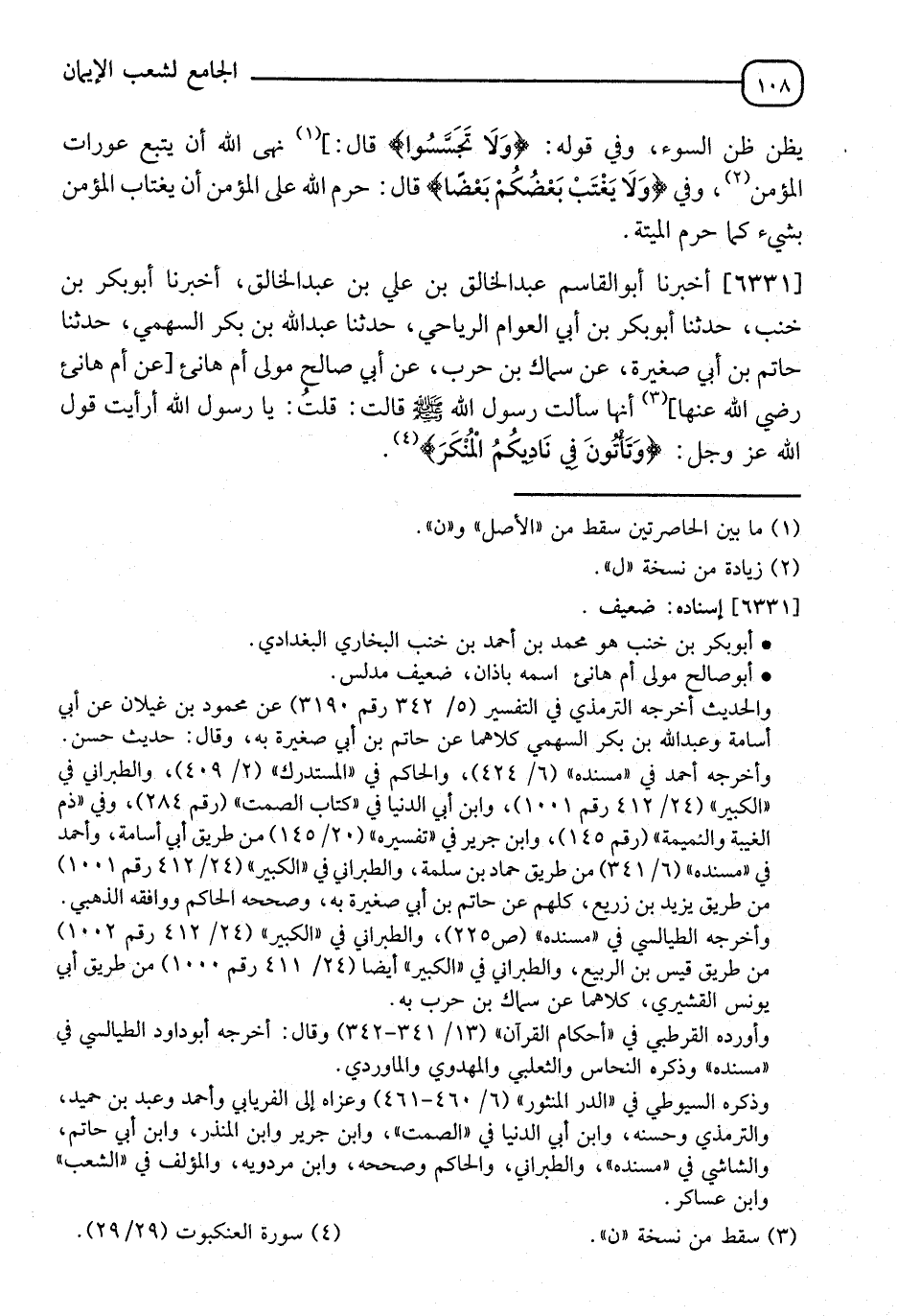 6331 - أَخْبَرَنَا أَبُو الْقَاسِمِ عَبْدُ الْخَالِقِ بْنُ عَلِيِّ بْنِ عَبْدِ الْخَالِقِ، أَنَا أَبُو بَكْرٍ خنبٌ، نا أَبُو بَكْرِ بْنُ أَبِي الْعَوَّامِ الرِّيَاحِيُّ، نا عَبْدُ اللهِ بْنُ بَكْرٍ السَّهْمِيُّ، نا حَاتِمُ بْنُ أَبِي صَغِيرَةَ، عَنْ سِمَاكِ بْنِ حَرْبٍ، عَنْ أَبِي صَالِحٍ مَوْلَى أُمِّ هَانِئٍ، عَنْ أُمِّ هَانِئٍ، أَنَّهَا سَأَلَتْ رَسُولَ اللهِ صَلَّى اللَّهُ عَلَيْهِ وَسَلَّمَ: قَالَتْ: قُلْتُ: يَا رَسُولَ اللهِ أَرَأَيْتَ قَوْلَ اللهِ عَزَّ وَجَلَّ: وَتَأْتُونَ فِي نَادِيكُمُ الْمُنْكَرَ -[109]- مَا ذَلِكَ الْمُنْكَرُ الَّذِي كَانُوا يَأْتُونَ فِي نَادِيهِمْ؟ قَالَ: " كَانُوا §يَسْخَرُونَ بِأَهْلِ الطَّرِيقِ وَيُخَوِّفُونَهُمْ "، تَابَعَهُ يَزِيدُ بْنُ زُرَيْعٍ، وَغَيْرُهُ، عَنْ حَاتِمِ بْنِ أَبِي صَغِيرَةَ