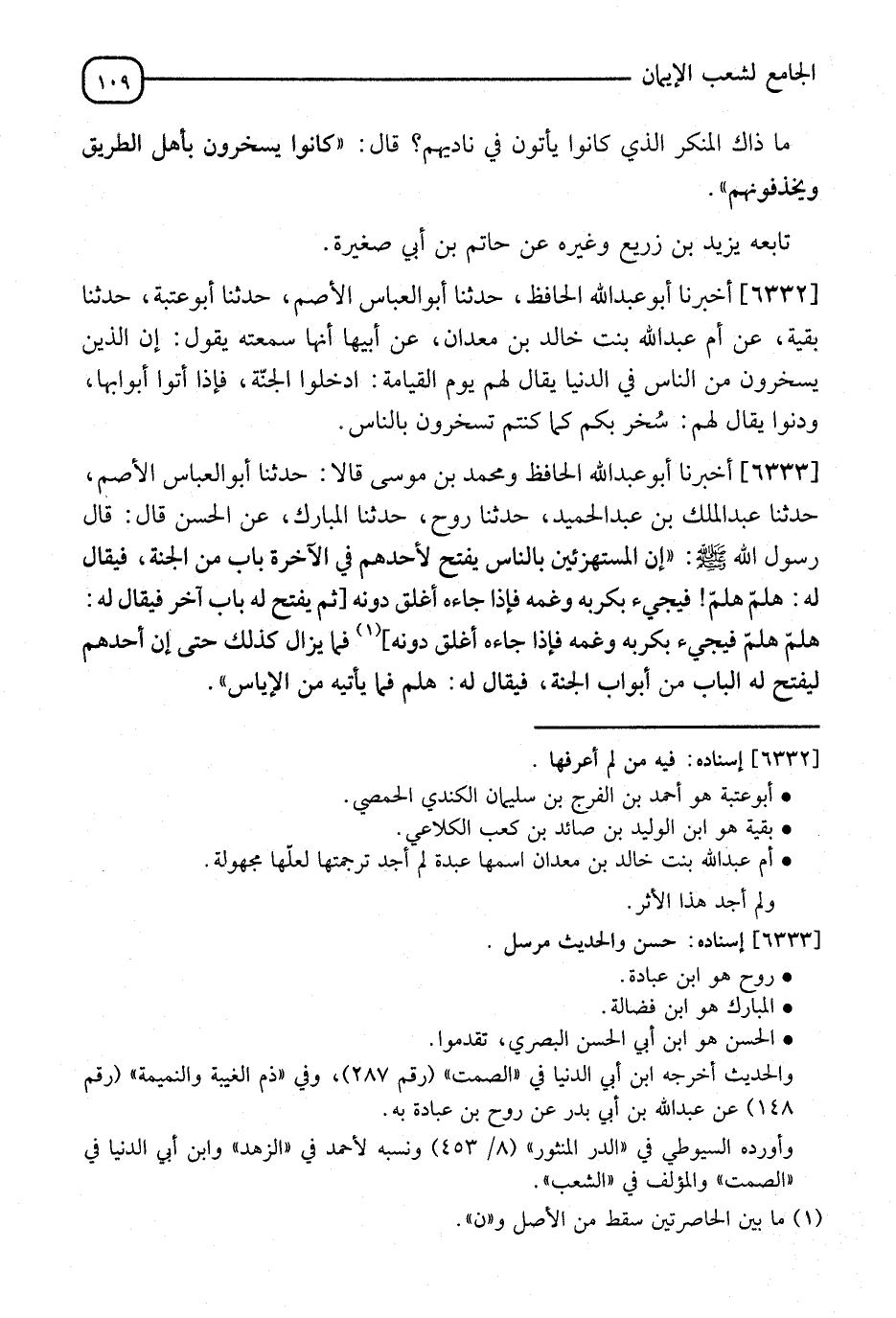6332 - أَخْبَرَنَا أَبُو عَبْدِ اللهِ الْحَافِظُ، نا أَبُو الْعَبَّاسِ الْأَصَمُّ، نا أَبُو عُتْبَةَ، نا بَقِيَّةُ، عَنْ أُمِّ عَبْدِ اللهِ بِنْتِ خَالِدِ بْنِ مَعْدَانَ، عَنْ أَبِيهَا، أَنَّهَا سَمِعَتْهُ يَقُولُ: " إِنَّ §الَّذِينَ يَسْخَرُونَ مِنَ النَّاسِ فِي الدُّنْيَا يُقَالُ لَهُمْ يَوْمَ الْقِيَامَةِ: ادْخُلُوا الْجَنَّةَ، فَإِذَا أَتَوْا أَبْوَابَهَا وَدَنَوْا يُقَالُ لَهُمْ: يُسْخَرُ بِكُمْ كَمَا كُنْتُمْ تَسْخَرُونَ بِالنَّاسِ "