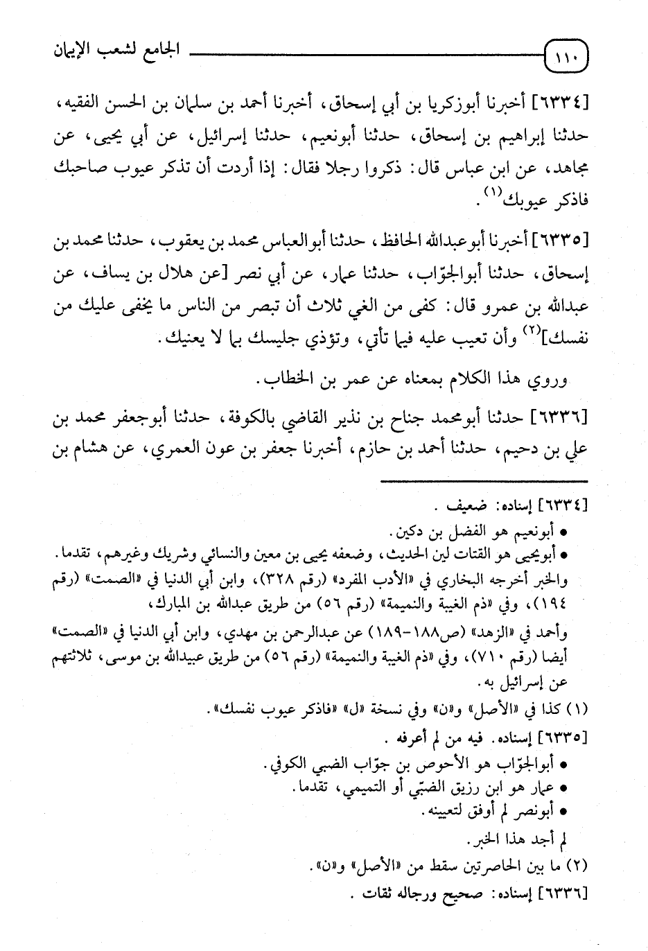 6335 - أَخْبَرَنَا أَبُو عَبْدِ اللهِ الْحَافِظُ، نا أَبُو الْعَبَّاسِ مُحَمَّدُ بْنُ يَعْقُوبَ، نا مُحَمَّدُ بْنُ إِسْحَاقَ، نا أَبُو الْجَوَّابِ، نا عَمَّارٌ، عَنْ أَبِي نَضْرَةَ، " وَأَنْ §تَعِيبَ عَلَيْهِ فِيمَا يَأْتِي وَتُؤْذِيَ جَلِيسَكَ بِمَا لَا يَعْنِيكَ ". وَرُوِيَ هَذَا الْكَلَامُ بِمَعْنَاهُ عَنْ عُمَرَ بْنِ الْخَطَّابِ
