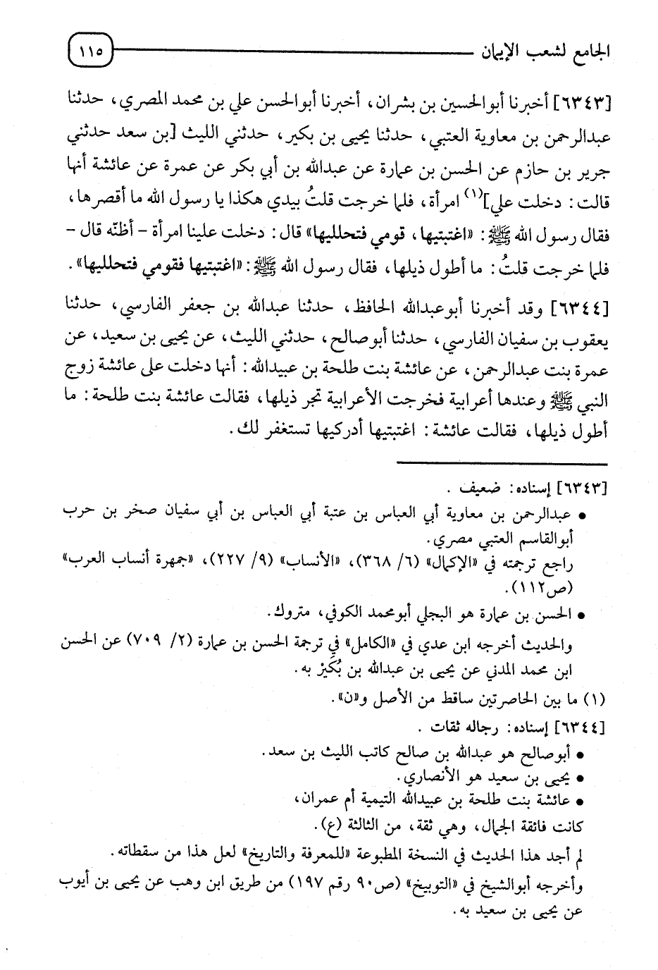 6343 - أَخْبَرَنَا أَبُو الْحُسَيْنِ بْنُ بِشْرَانَ، أَنَا أَبُو الْحَسَنِ عَلِيُّ بْنُ مُحَمَّدٍ الْمِصْرِيُّ، نا عَبْدُ الرَّحْمَنِ بْنُ مُعَاوِيَةَ الْعُتْبِيُّ، نا يَحْيَى بْنُ بُكَيْرٍ، حَدَّثَنِي اللَّيْثُ،. . . امْرَأَةٌ، فَلَمَّا خَرَجَتْ قُلْتُ بِيَدِي هَكَذَا يَا رَسُولَ اللهِ: §مَا أَقْصَرَهَا فَقَالَ رَسُولُ اللهِ صَلَّى اللَّهُ عَلَيْهِ وَسَلَّمَ: " اغْتَبْتِيهَا قُومِي فَتَحَلَّلِيهَا "، قَالَ: وَدَخَلَتْ عَلَيْنَا امْرَأَةٌ. . . أَظُنُّهُ قَالَ: فَلَمَّا خَرَجَتْ، قُلْتُ: مَا أَطْوَلَ ذَيْلَهَا فَقَالَ رَسُولُ اللهِ صَلَّى اللَّهُ عَلَيْهِ وَسَلَّمَ: " اغْتَبْتِيهَا فَقُومِي فَتَحَلَّلِيهَا ". كَذَا رُوِيَ هَذَا الْحَدِيثُ بِهَذَا الْإِسْنَادِ وَقَدْ