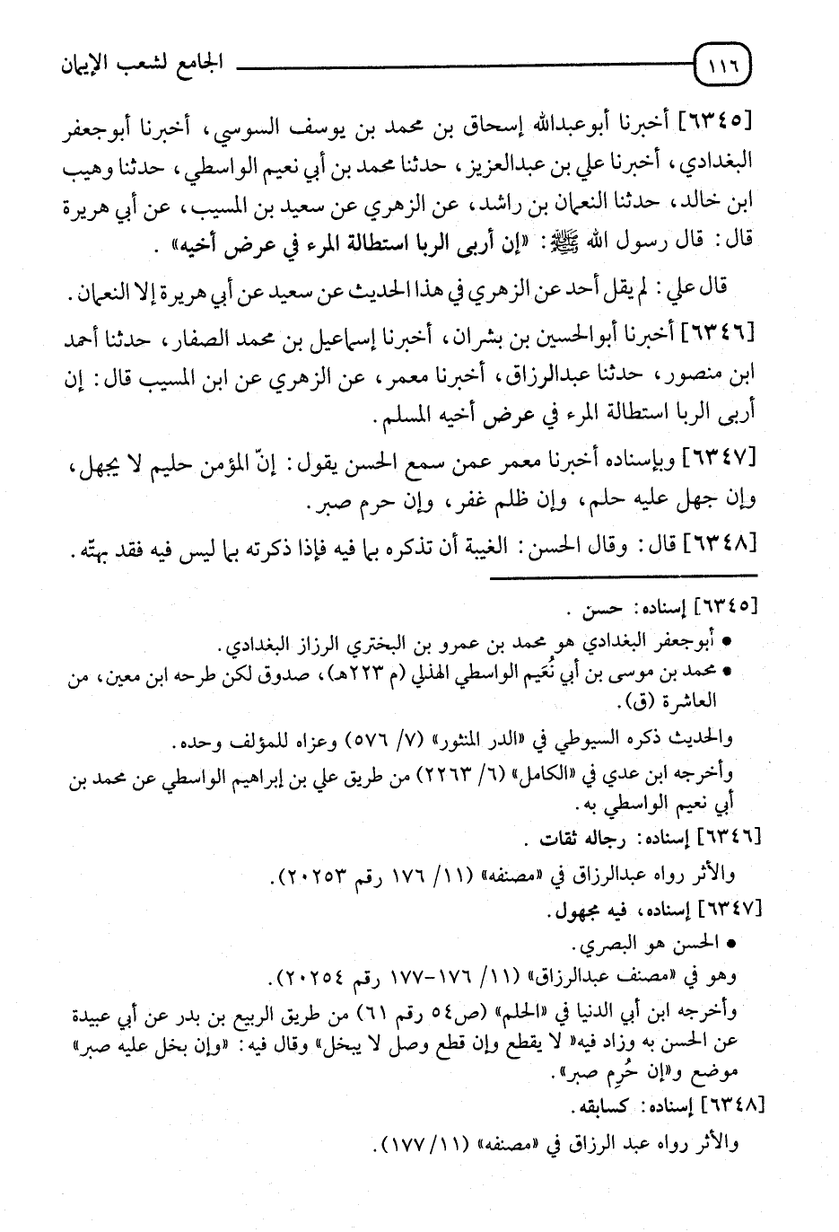 6346 - أَخْبَرَنَا أَبُو الْحُسَيْنِ بْنُ بِشْرَانَ، أَنَا إِسْمَاعِيلُ بْنُ مُحَمَّدٍ الصَّفَارُ، نا أَحْمَدُ بْنُ مَنْصُورٍ، نا عَبْدُ الرَّزَّاقِ، أَنَا مَعْمَرٌ، عَنِ الزُّهْرِيِّ، عَنِ ابْنِ الْمُسَيِّبِ، قَالَ: " إِنَّ §أَرْبَى الرِّبَا اسْتِطَالَةُ الْمَرْءِ فِي عِرْضِ أَخِيهِ الْمُسْلِمِ "