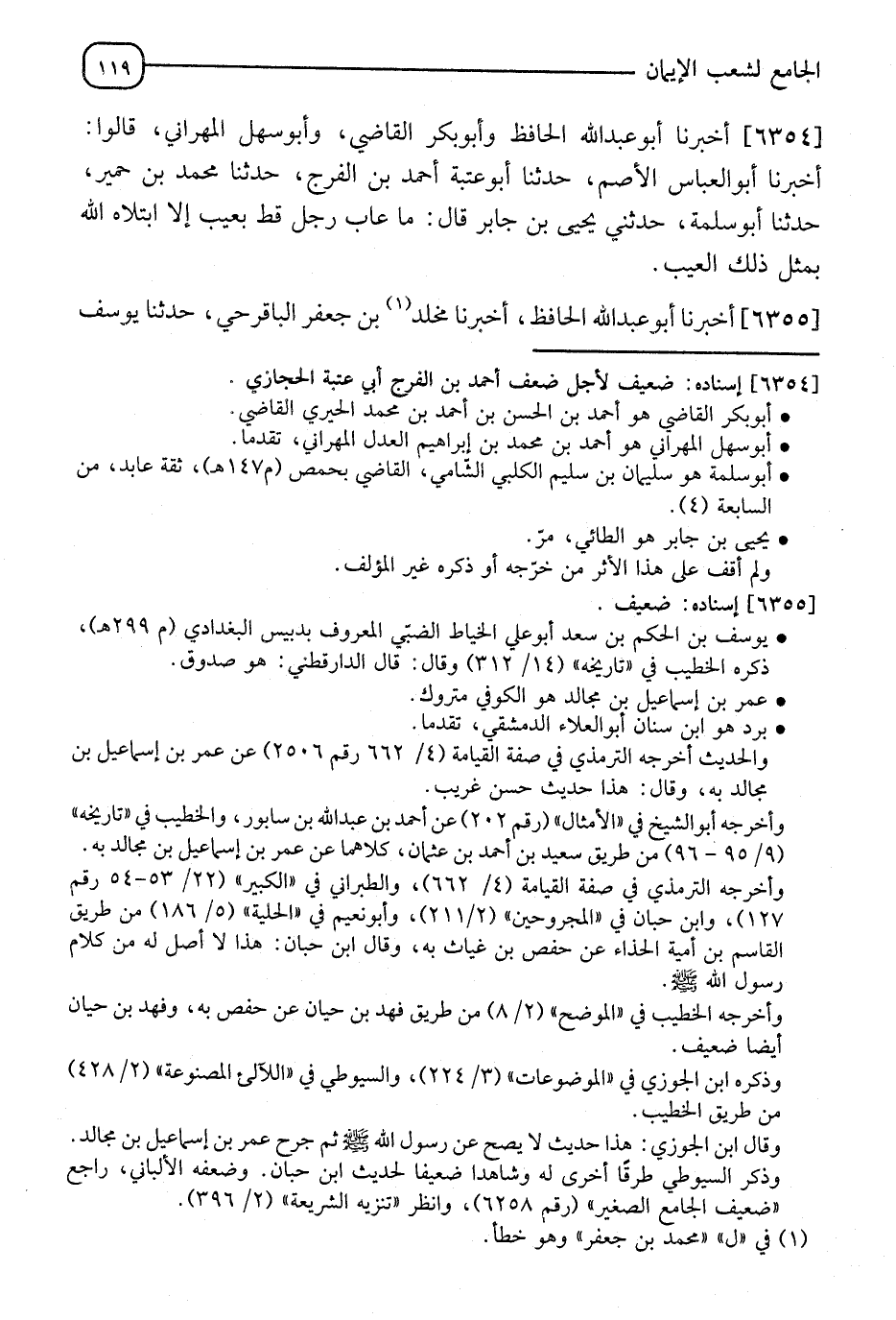 6354 - أَخْبَرَنَا أَبُو عَبْدِ اللهِ الْحَافِظُ، وَأَبُو بَكْرٍ الْقَاضِي، وَأَبُو سَهْلٍ الْمِهْرَانِيُّ، قَالُوا: نا أَبُو الْعَبَّاسِ الْأَصَمُّ، نا أَبُو عُتْبَةَ أَحْمَدُ بْنُ الْفَرَجِ، نا مُحَمَّدُ بْنُ حِمْيَرَ، نا أَبُو سَلَمَةَ، حَدَّثَنِي يَحْيَى بْنُ جَابِرٍ، قَالَ: §" مَا عَابَ رَجُلٌ قَطُّ بِعَيْبٍ إِلَّا ابْتَلَاهُ اللهُ بِمِثْلِ ذَلِكَ الْعَيْبِ "