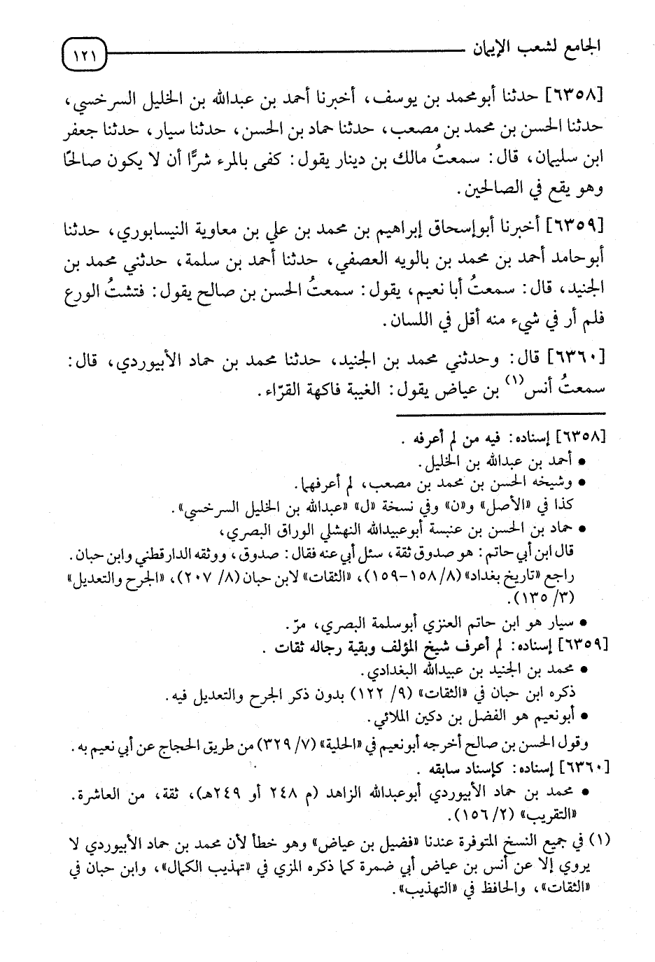 6359 - ثَنَا أَبُو إِسْحَاقَ إِبْرَاهِيمُ بْنُ مُحَمَّدِ بْنِ عَلِيِّ بْنِ مُعَاوِيَةَ النَّيْسَابُورِيُّ، نا أَبُو حَامِدٍ أَحْمَدُ بْنُ مُحَمَّدِ بْنِ بَالَوَيْهِ الْعَفَصِيُّ، نا أَحْمَدُ بْنُ سَلَمَةَ، حَدَّثَنِي مُحَمَّدُ بْنُ الْجُنَيْدِ، قَالَ: سَمِعْتُ أَبَا نُعَيْمٍ، يَقُولُ: سَمِعْتُ الْحَسَنَ بْنَ صَالِحٍ، يَقُولُ: §" فَتَّشْتُ الْوَرَعَ فَلَمْ أَرَ فِي شَيْءٍ أَقَلَّ فِي اللِّسَانِ "