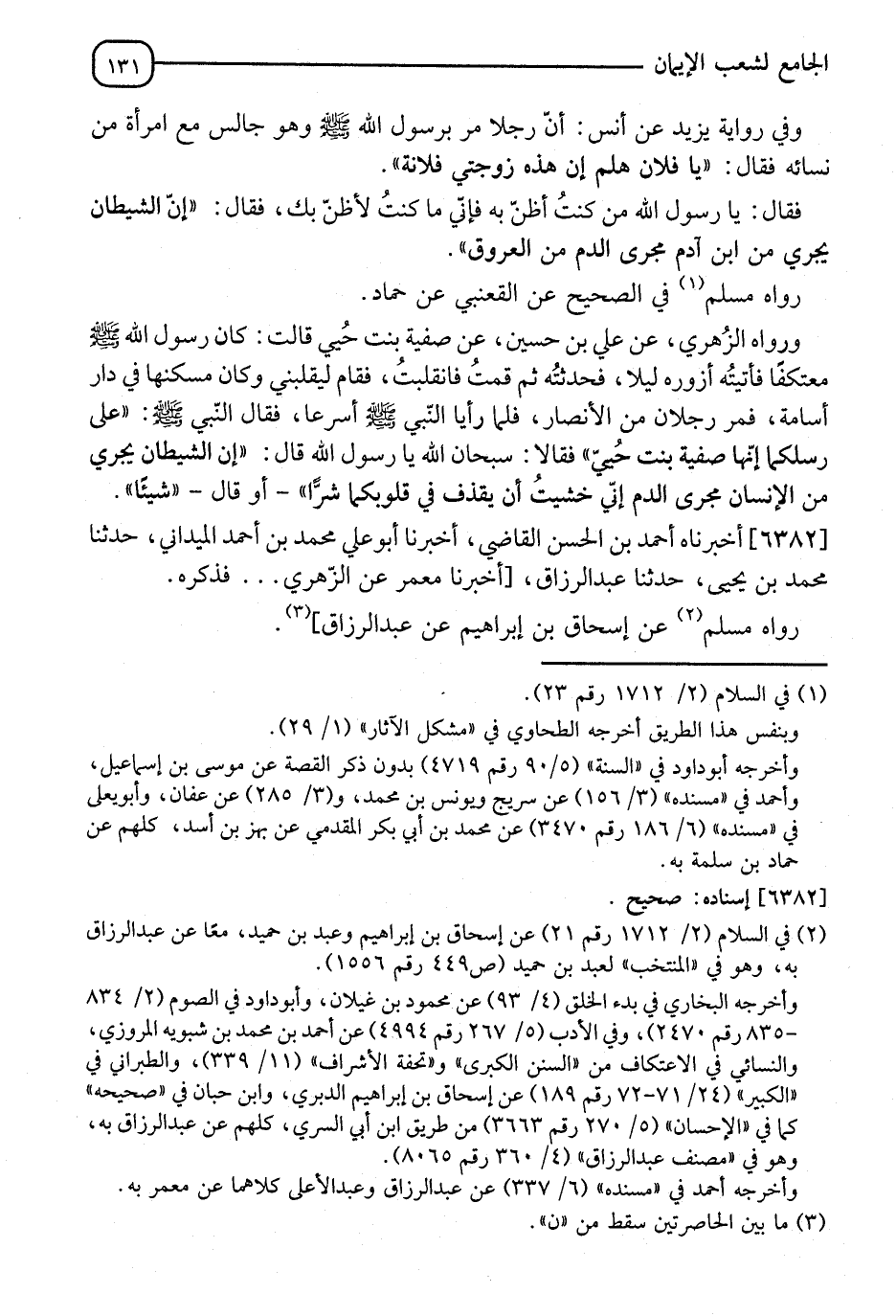 وَفِي رِوَايَةِ يَزِيدَ، عَنْ أَنَسٍ أَنَّ رَجُلًا مَرَّ بِرَسُولِ اللهِ صَلَّى اللَّهُ عَلَيْهِ وَسَلَّمَ وَهُوَ جَالِسٌ مَعَ امْرَأَةٍ مِنْ نِسَائِهِ، فَقَالَ: " يَا فُلَانُ، هَلُمَّ إِنَّ هَذِهِ زَوْجَتِي فُلَانَةُ "، قَالَ: يَا رَسُولَ اللهِ، مَنْ كُنْتُ أَظُنُّ بِهِ فَإِنِّي مَا كُنْتُ لَأَظُنُّ بِكَ. فَقَالَ: " إِنَّ §الشَّيْطَانَ يَجْرِي مِنَ ابْنِ آدَمَ مَجْرَى الدَّمِ مِنَ الْعُرُوقِ ". رَوَاهُ مُسْلِمٌ فِي الصَّحِيحِ، عَنِ الْقَعْنَبِيِّ، عَنْ حَمَّادٍ