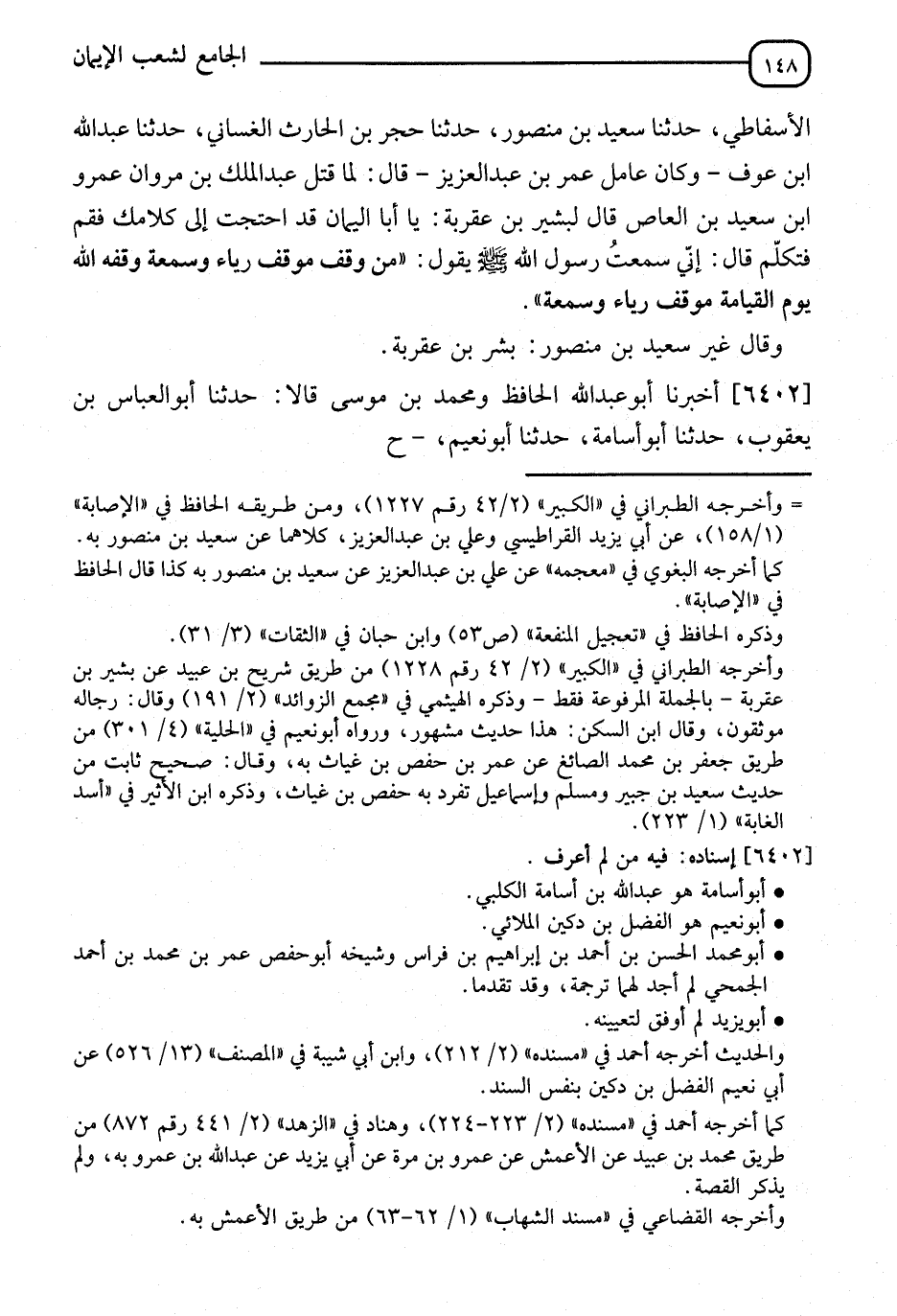 6402 - أَخْبَرَنَا أَبُو عَبْدِ اللهِ الْحَافِظُ، وَمُحَمَّدُ بْنُ مُوسَى، قَالَا: نا أَبُو الْعَبَّاسِ بْنُ يَعْقُوبَ، نا أَبُو أُسَامَةَ، نا أَبُو نُعَيْمٍ، -[149]- وَأَخْبَرَنَا أَبُو مُحَمَّدٍ الْحَسَنُ بْنُ أَحْمَدَ بْنِ إِبْرَاهِيمَ بْنِ فِرَاسٍ بِمَكَّةَ فِي الْمَسْجِدِ الْحَرَامِ، أَنَا أَبُو حَفْصٍ عُمَرُ بْنُ مُحَمَّدِ بْنِ أَحْمَدَ بْنِ عَبْدِ الرَّحْمَنِ بْنِ عَمْرِو بْنِ أَبِي سُفْيَانَ بْنِ عَبْدِ الرَّحْمَنِ بْنِ صَفْوَانَ بْنِ أُمَيَّةَ صَاحِبِ رَسُولِ اللهِ صَلَّى اللَّهُ عَلَيْهِ وَسَلَّمَ، نا أَبُو الْحَسَنِ عَلِيُّ بْنُ عَبْدِ الْعَزِيزِ، نا أَبُو نُعَيْمٍ، نا الْأَعْمَشُ، نا عَمْرُو بْنُ مُرَّةَ، قَالَ: كُنَّا جُلُوسًا عِنْدَ أَبِي عُبَيْدَةَ فَذَكَرَ الرِّيَاءَ، فَقَالَ: وَفِي رِوَايَةِ أَبِي أُسَامَةَ: كُنَّا عِنْدَ أَبِي عُبَيْدَةَ فَذَكَرَ الرِّيَاءَ، فَقَالَ شَيْخٌ يُكْنَى أَبَا يَزِيدَ، سَمِعْتُ عَبْدَ اللهِ بْنَ عَمْرٍو، يَقُولُ: قَالَ رَسُولُ اللهِ صَلَّى اللَّهُ عَلَيْهِ وَسَلَّمَ: §" مَنْ سَمَّعَ النَّاسَ بِعَمَلِهِ سَمَّعَ اللهُ سَامِعَ خَلْقِهِ يَوْمَ الْقِيَامَةِ، وَصغَّرَهُ وَحَقَّرَهُ "