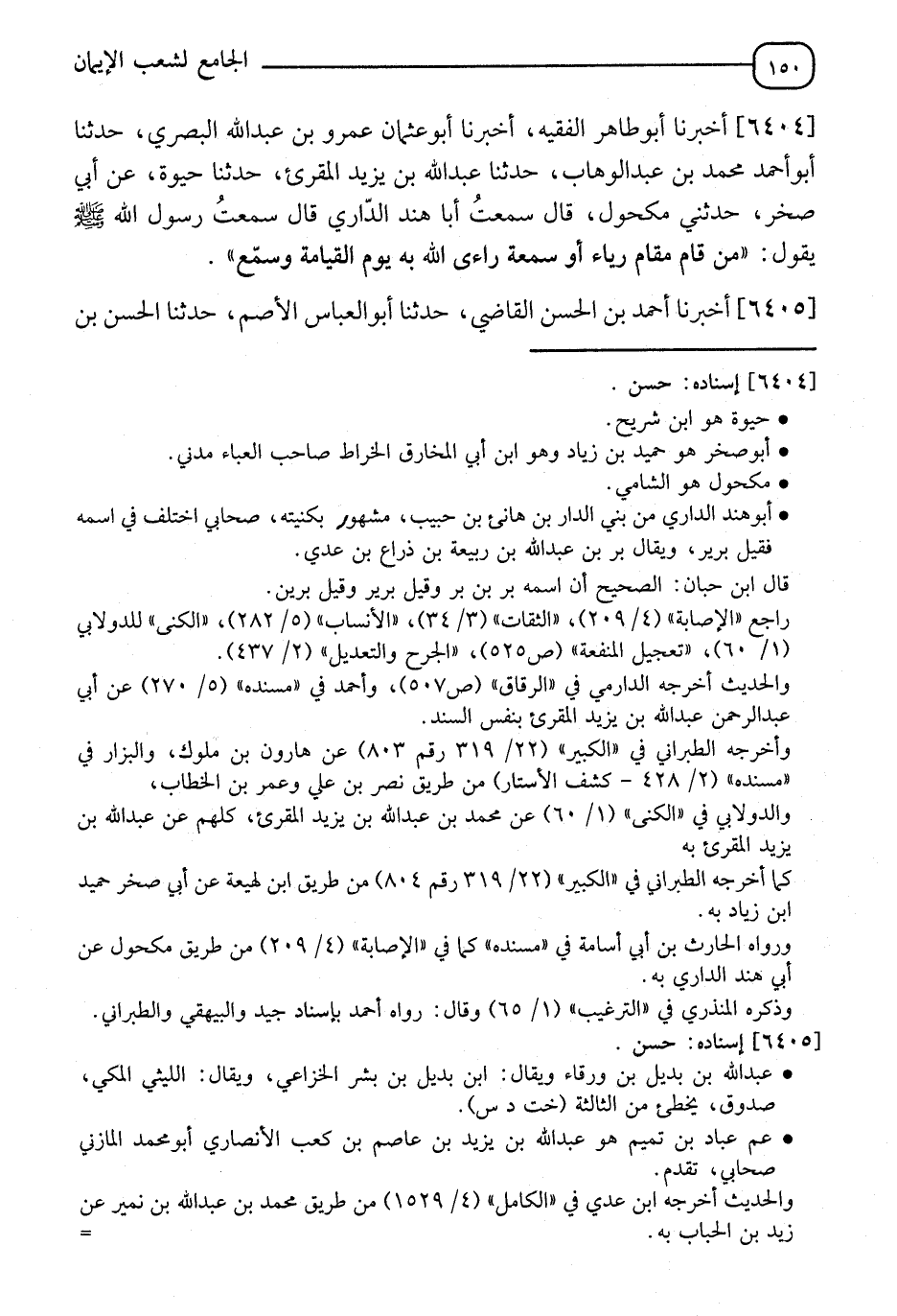 6404 - أَخْبَرَنَا أَبُو طَاهِرٍ الْفَقِيهُ، أَنَا أَبُو عُثْمَانَ بْنُ عَبْدِ اللهِ الْبَصْرِيُّ، نا أَبُو أَحْمَدَ مُحَمَّدُ بْنُ عَبْدِ الْوَهَّابِ، نا عَبْدُ اللهِ بْنُ يَزِيدَ الْمُقْرِئُ، نا حَيْوَةُ، عَنْ أَبِي صَخْرٍ، حَدَّثَنِي مَكْحُولٌ، قَالَ: سَمِعْتُ أَبَا هِنْدٍ الدَّارِيَّ، قَالَ: سَمِعْتُ رَسُولَ اللهِ صَلَّى اللَّهُ عَلَيْهِ وَسَلَّمَ يَقُولُ: §" مَنْ قَامَ مَقَامَ رِيَاءٍ أَوْ سُمْعَةٍ رَايَا اللهُ يَوْمَ الْقِيَامَةِ وَسَمَّعَ "