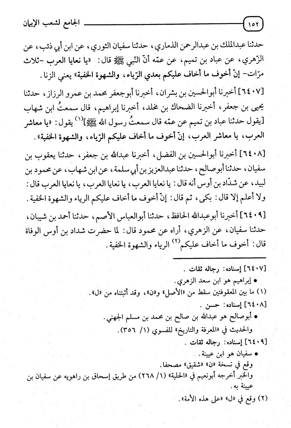 6407 - أَخْبَرَنَا أَبُو الْحُسَيْنِ بْنُ بِشْرَانَ، أَنَا أَبُو جَعْفَرٍ مُحَمَّدُ بْنُ عَمْرٍو الرَّزَّازُ، نا يَحْيَى بْنُ جَعْفَرٍ، نا الضَّحَّاكُ بْنُ مَخْلَدٍ، أَنَا إِبْرَاهِيمُ، قَالَ: سَمِعْتُ ابْنَ شِهَابٍ يَقُولُ: " يَا مَعَاشِرَ الْعَرَبِ، إِنَّ §أَخْوَفَ مَا أَخَافُ عَلَيْكُمُ الرِّيَاءُ، وَالشَّهْوَةُ الْخَفِيَّةُ "