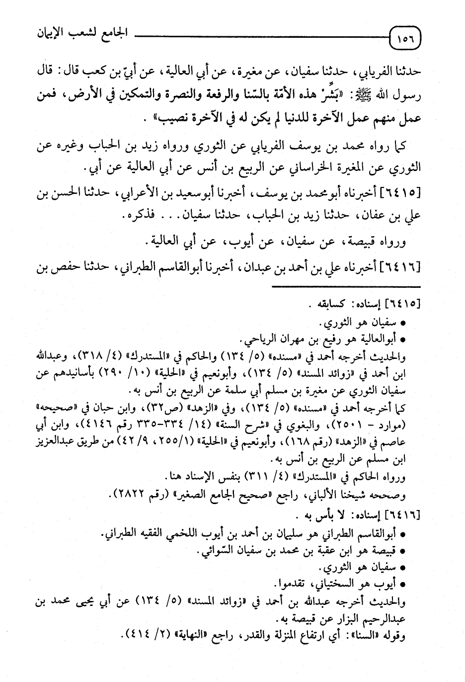 6416 - أَخْبَرَنَاهُ عَلِيُّ بْنُ أَحْمَدَ بْنِ عَبْدَانَ، أَنَا أَبُو الْقَاسِمِ الطَّبَرَانِيُّ، نا حَفْصُ بْنُ -[157]- عُمَرَ، نا قَبِيصَةُ، نا سُفْيَانُ، عَنْ أَبِي أَيُّوبَ، عَنْ أَبِي الْعَالِيَةِ، عَنْ أُبَيِّ بْنِ كَعْبٍ، قَالَ: قَالَ رَسُولُ اللهِ صَلَّى اللَّهُ عَلَيْهِ وَسَلَّمَ: " §بَشِّرْ هَذِهِ الْأُمَّةَ بِالتَّيْسِيرِ، وَالسَّنَاءِ، وَالرِّفْعَةِ فِي الدِّينِ، وَالتَّمْكِينِ فِي الْبِلَادِ، وَالنَّصْرِ، فَمَنْ عَمِلَ مِنْهُمْ عَمَلًا بِعَمَلِ الْآخِرَةِ لِلدُّنْيَا فَلَيْسَ لَهُ فِي الْآخِرَةِ مِنْ نَصِيبٍ ". قَالَ الْحَلِيمِيُّ رَحِمَهُ اللهُ: " فَثَبَتَ بِالْقُرْآنِ وَالسُّنَّةِ أَنَّ كُلَّ عَمَلٍ أَمْكَنَ أَنْ يُرَادَ بِهِ وَجْهُ اللهِ إِذَا لَمْ يُعْمَلْ لِمُجَرَّدِ التَّقَرُّبِ بِهِ إِلَيْهِ وَابْتِغَاءِ رِضْوَانِهِ حَبِطَ، وَلَمْ يَسْتَوْجِبْ بِهِ ثَوَابًا إِلَّا أَنَّ لِذَلِكَ تَفْصِيلًا، وَهُوَ أَنَّ الْعَمَلَ إِنْ كَانَ مِنْ جُمْلَةِ الْفَرَائِضِ، فَمَنْ أَدَّاهُ وَأَرَادَ بِهِ الْفَرْضَ غَيْرَ أَنَّهُ أَدَّاهُ بِنِيَّةِ الْفَرْضِ لَيَقُولَ النَّاسُ: إِنَّهُ فَعُولٌ لِكَذَا إِبْطَالًا لِرِضْوَانِ اللهِ وَاتِّقَاءً لِسَخَطِهِ سَقَطَ عَنْهُ الْفَرْضُ، وَلَمْ يُؤَاخَذْ بِهِ فِي الْآخِرَةِ وَلَمْ يُعَاقَبْ بِهِ التَّارِكُ، وَلَكِنَّهُ لَا يَسْتَوْجِبُ بِهِ ثَوَابًا إِنَّمَا ثَوَابَهُ ثَنَاءُ النَّاسِ عَلَيْهِ فِي الدُّنْيَا، وَمَدْحُهُمْ إِيَّاهُ بِمَا فَعَلَ وَإِنْ كَانَ الْعَمَلُ مِنْ بَابِ التَّطَوُّعِ يَفْعَلُهُ يُرِيدُ بِهِ وُجُوهَ النَّاسِ دُونَ وَجْهِ اللهِ تَعَالَى جَدُّهُ فَإِنَّ أَجْرَهُ يَحْبَطُ وَلَا يَحْصُلُ مِنْ عَمَلِهِ عَلَى شَيْءٍ يَكُونُ لَهُ كَمَا حَصَلَ الْأَوَّلُ عَلَى سُقُوطِ الْفَرْضِ عَنْهُ، ثُمَّ يُعَاقِبُهُمَا عَلَى أَنَّهُمَا عَمِلَا لَا لِوَجْهِ اللهِ تَعَالَى، وَتَمَامًا ثَوَابُ اللهِ بِمَحْمَدَةِ النَّاسِ يَحْتَمِلُ وَجْهَيْنِ، أَحَدُهُمَا أَنْ يُقَالَ: إِنَّ الَّذِي جَاءَ بِهِ الْحَدِيثُ مِنْ قَوْلِ اللهِ عَزَّ وَجَلَّ فَقَدْ قِيلَ: ذَلِكَ اذْهَبُوا بِهِ إِلَى النَّارِ إِخْبَارٌ بِأَنَّ الْمُرَائِي يُعَاقَبُ عَنْ عُدُولِهِ عَنْ قَصْدِ وَجْهِ اللهِ إِلَى وَجْهِ النَّاسِ، وَمَعْنَى هَذَا أَنَّهُ اسْتَخَفَّ وَجْهَ اللهِ وَاسْتَهَانَ نِعْمَتَهُ فَلَمْ يَجُزْ أَنْ يَقْصُرَ ذَلِكَ عَنْ ذَنْبِ غَيْرِهِ، وَالذَّنُوبُ كُلُّهَا مُوجِبَةٌ لِلْعِقَابِ فَكَذَلِكَ هَذَا قُلْتُ: إِلَّا أَنْ يَعْفُوَ اللهُ، وَالْوَجْهُ الْآخَرُ أَنَّهُ لَا يُعَاقَبُ وَلَا يُثَابُ، وَمَعْنَى الْحَدِيثِ أَنَّ هَذِهِ الْأَعْمَالَ الَّتِي رَايَاهَا لَا تَنْفَعُهُ، فَيَثْقُلُ بِهَا مِيزَانُهُ وَيُرَجَّحُ بِهَا كَفَّةُ الطَّاعَاتِ كَفَّةَ الْمَعَاصِي، لَا أَنَّهُ يُعَاقَبُ عَلَى الرِّيَاءِ بِالنَّارِ، إِنَّمَا عُقُوبَةُ الرِّيَاءِ إِحْبَاطُ الْعَمَلِ فَقَطْ، وَوَجْهُ هَذَا أَنَّهُ عَمِلَ مَا عَمِلَ عِبَادَةً لِلَّهِ عَزَّ وَجَلَّ، إِلَّا أَنَّهُ أَرَادَ بِعَمَلِهِ حَمْدَ النَّاسِ فَإِذَا أُحِيلَ عَلَيْهِمْ فَقَدْ جُوزِيَ -[158]- بِصَنِيعِهِ، وَلَيْسَ لَهُ وَرَاءَ ذَلِكَ ذَنْبٌ يَسْتَوْجِبُ عِقَابًا؛ لِأَنَّ جَمِيعَ عَمَلِهِ شَيْئَانِ أَحَدُهُمَا فِعْلٌ لَمْ يَخْلُ مِنْ أَنْ يَكُونَ فِعْلُهُ عِبَادَةً لِلَّهِ تَعَالَى، لِأَنَّهُ لَوْ أَرَادَ عِبَادَةَ غَيْرِهِ لَكَفَرَ وَالْآخَرُ قَصْدُهُ أَنْ يَمْدَحَهُ النَّاسُ بِفِعْلِهِ لَا أَنْ يُثَابَ عَلَيْهِ فَأَمَّا الْأَوَّلُ فَلَيْسَ بِذَنْبٍ، وَأَمَّا الثَّانِي فَهُوَ الذَّنْبُ فَإِذَا لَمْ يَتُبْ وَقَصَّرَ عَلَى قَوْلِ النَّاسِ فَقَدْ جُوزِيَ فَثَبَتَ أَنَّ ذَلِكَ قُصَارَى أَمْرِهِ وَاللهُ أَع