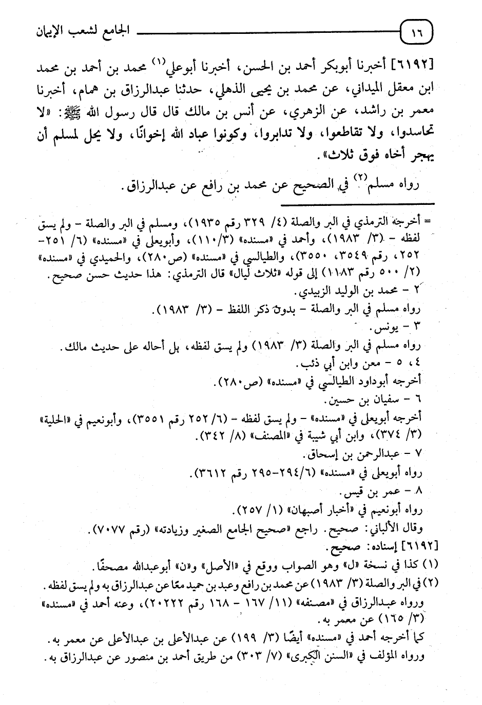 6192 - أَخْبَرَنَا أَبُو بَكْرٍ أَحْمَدُ بْنُ الْحَسَنِ، أَنَا أَبُو عَبْدِ اللهِ مُحَمَّدُ بْنُ أَحْمَدَ بْنِ مُحَمَّدِ بْنِ مَعْقِلٍ الْمَيْدَانِيُّ، عَنْ مُحَمَّدِ بْنِ يَحْيَى الذُّهْلِيِّ، نا عَبْدُ الرَّزَّاقِ بْنُ هَمَّامٍ، أَنَا مَعْمَرُ بْنُ رَاشِدٍ، عَنِ الزُّهْرِيِّ، عَنْ أَنَسِ بْنِ مَالِكٍ، قَالَ: قَالَ رَسُولُ اللهِ صَلَّى اللَّهُ عَلَيْهِ وَسَلَّمَ: §" لَا تَحَاسَدُوا، وَلَا تَقَاطَعُوا، وَلَا تَدَابَرُوا وَكُونُوا عِبَادَ اللهِ إِخْوَانًا، لَا يَحِلُّ لِمُسْلِمٍ أَنْ يَهْجُرَ أَخَاهُ فَوْقَ ثَلَاثٍ ". رَوَاهُ مُسْلِمٌ فِي الصَّحِيحِ، عَنْ مُحَمَّدِ بْنِ رَافِعٍ، عَنْ عَبْدِ الرَّزَّاقِ