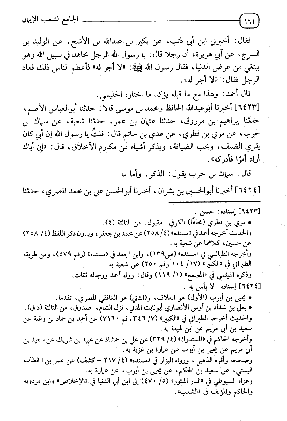 6423 - أَخْبَرَنَا أَبُو عَبْدِ اللهِ الْحَافِظُ، وَمُحَمَّدُ بْنُ مُوسَى، قَالَا: نا أَبُو الْعَبَّاسِ الْأَصَمُّ، نا إِبْرَاهِيمُ بْنُ مَرْزُوقٍ، نا عُثْمَانُ بْنُ عُمَرَ، نا شُعْبَةُ، عَنْ سِمَاكِ بْنِ حَرْبٍ، عَنْ مُرِيِّ بْنِ قَطَرِيٍّ، عَنْ عَدِيِّ بْنِ حَاتِمٍ، قَالَ: قُلْتُ: يَا رَسُولَ اللهِ، إِنَّ أَبِي كَانَ §يَقْرِي الضَّيْفَ، وَيُحِبُّ الضِّيَافَةَ، وَيَذْكُرُ أَشْيَاءَ مِنْ مَكَارِمِ الْأَخْلَاقِ، قَالَ: " إِنَّ أَبَاكَ أَرَادَ أَمْرًا فَأَدْرَكَهُ ". قَالَ سِمَاكٌ: يَقُولُ الذِّكْرُ