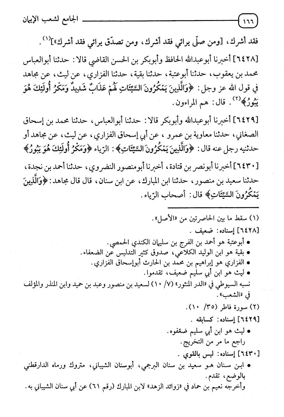 6428 - أَخْبَرَنَا أَبُو عَبْدِ اللهِ الْحَافِظُ، وَأَبُو بَكْرِ بْنُ الْحَسَنِ الْقَاضِي، نا أَبُو الْعَبَّاسِ مُحَمَّدُ بْنُ يَعْقُوبَ، نا أَبُو عُتْبَةَ، نا بَقِيَّةُ، نا الْفَزَارِيُّ، عَنْ لَيْثٍ، عَنْ مُجَاهِدٍ، فِي قَوْلِ اللهِ عَزَّ وَجَلَّ: {§وَالَّذِينَ يَمْكُرُونَ السَّيِّئَاتِ لَهُمْ عَذَابٌ شَدِيدٌ وَمَكْرُ أُولَئِكَ هُوَ يَبُورُ} [فاطر: 10]، قَالَ: " هُمُ الْمُرَاؤُونَ "