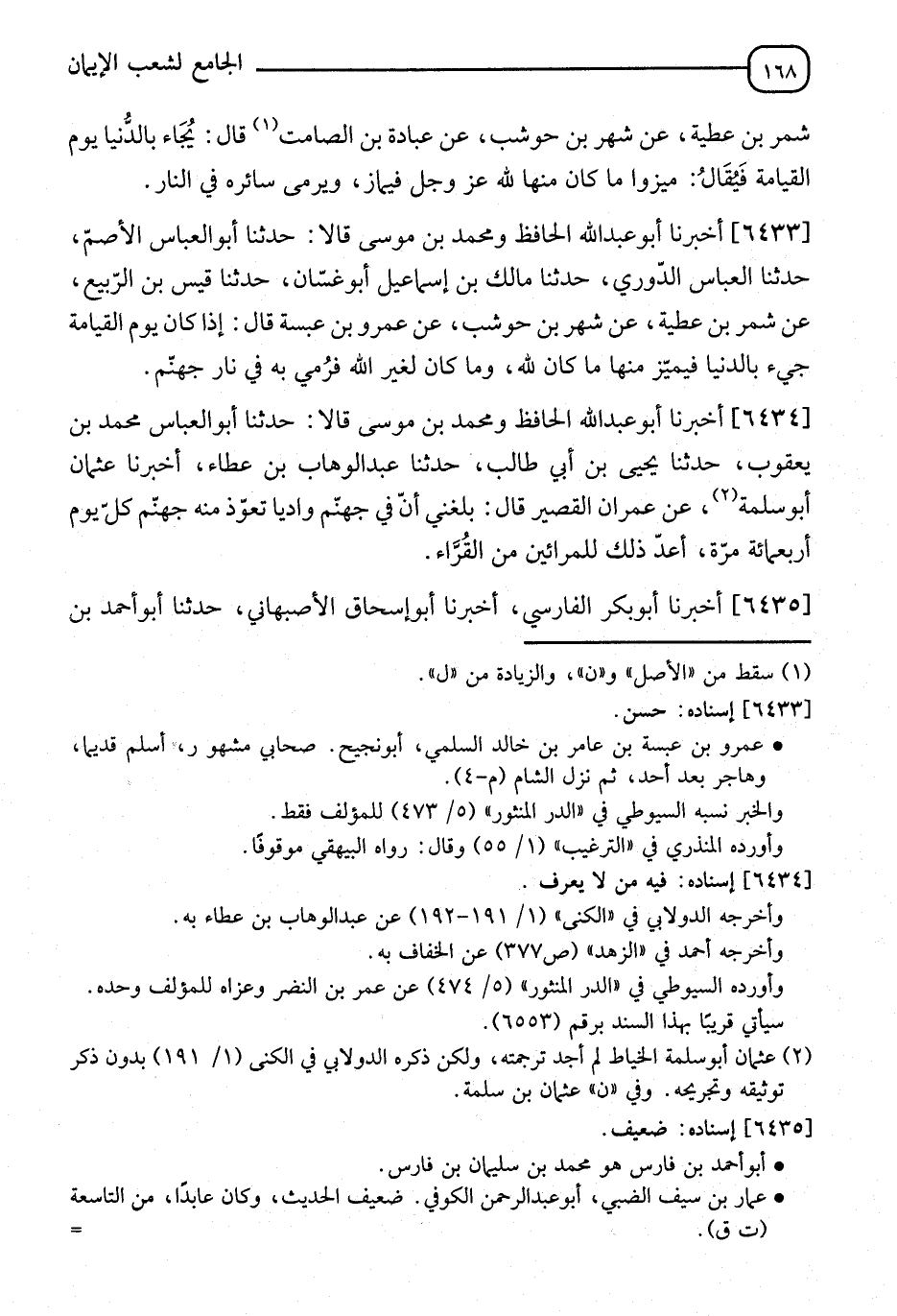 6433 - أَخْبَرَنَا أَبُو عَبْدِ اللهِ الْحَافِظُ، وَمُحَمَّدُ بْنُ مُوسَى، قَالَا: نا أَبُو الْعَبَّاسِ الْأَصَمُّ، نا الْعَبَّاسُ الدُّورِيُّ، نا مَالِكُ بْنُ إِسْمَاعِيلَ أَبُو غَسَّانَ، نا قَيْسُ بْنُ الرَّبِيعِ، عَنْ شِمْرِ بْنِ عَطِيَّةَ، عَنْ شَهْرِ بْنِ حَوْشَبٍ، عَنْ عَمْرِو بْنِ عَنْبَسَةَ، قَالَ: " إِذَا كَانَ §يَوْمُ الْقِيَامَةِ جِيءَ بِالدُّنْيَا فَيُمَيَّزُ مِنْهَا مَا كَانَ لِلَّهِ، وَمَا كَانَ لِغَيْرِ اللهِ رُمِيَ بِهِ فِي نَارِ جَهَنَّمَ "