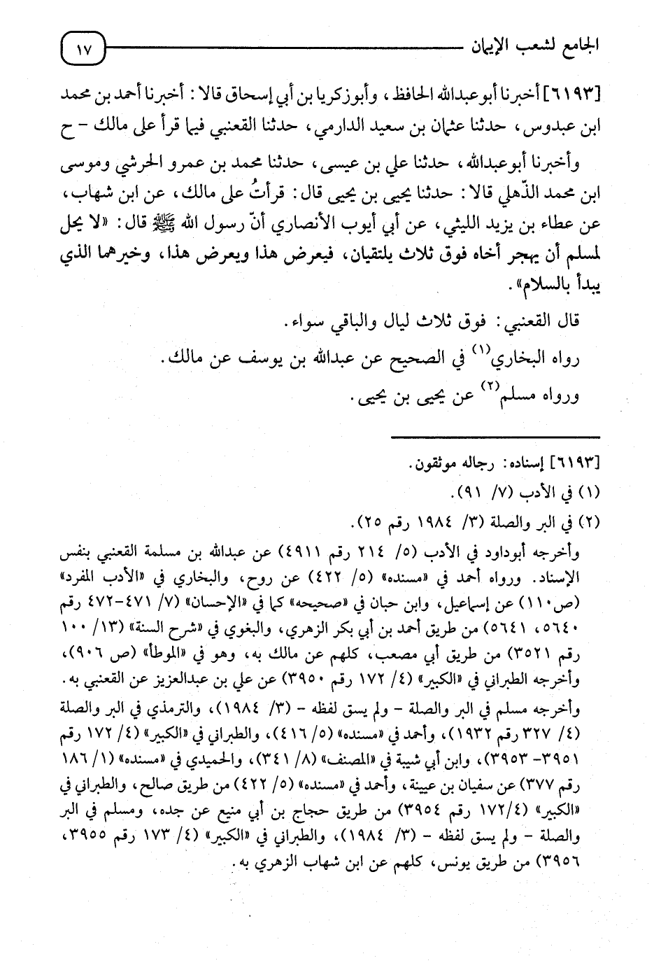 6193 - أَخْبَرَنَا أَبُو عَبْدِ اللهِ الْحَافِظُ، وَأَبُو زَكَرِيَّا بْنُ أَبِي إِسْحَاقَ، أَنَا أَحْمَدُ بْنُ مُحَمَّدِ بْنِ عَبْدُوسٍ، نا عُثْمَانُ بْنُ سَعِيدٍ الدَّارِمِيُّ، نا الْقَعْنَبِيُّ، فِيمَا قَرَأَ عَلَى مَالِكٍ، ح، وَأَخْبَرَنَا أَبُو عَبْدِ اللهِ، نا عَلِيُّ بْنُ عِيسَى، نا مُحَمَّدُ بْنُ عَمْرٍو الْجُرَشِيُّ، وَمُوسَى بْنُ مُحَمَّدٍ الذُّهْلِيُّ، نا يَحْيَى بْنُ يَحْيَى، قَالَ: قَرَأْتُ عَلَى مَالِكٍ، عَنِ ابْنِ شِهَابٍ، عَنْ عَطَاءِ بْنِ يَزِيدَ اللَّيْثِيِّ، عَنْ أَبِي أَيُّوبَ الْأَنْصَارِيِّ، أَنَّ رَسُولَ اللهِ صَلَّى اللَّهُ عَلَيْهِ وَسَلَّمَ قَالَ: " §لَا يَحِلُّ لِمُسْلِمٍ أَنْ يَهْجُرَ أَخَاهُ فَوْقَ ثَلَاثٍ، يَلْتَقِيَانِ فَيُعْرِضُ هَذَا وَيُعْرِضُ هَذَا وَخَيْرُهُمَا الَّذِي يَبْدَأُ بِالسَّلَامِ ". قَالَ الْقَعْنَبِيُّ: " فَوْقَ ثَلَاثٍ وَالْبَاقِي سَوَاءٌ ". رَوَاهُ الْبُخَارِيُّ فِي الصَّحِيحِ، عَنْ عَبْدِ اللهِ بْنِ يُوسُفَ، عَنْ مَالِكٍ وَرَوَاهُ مُسْلِمٌ، عَنْ يَحْيَى بْنِ يَحْيَى