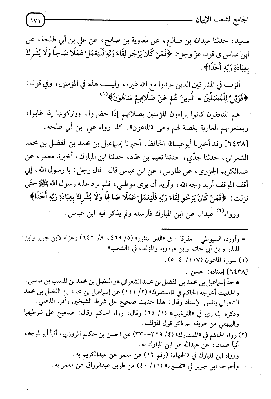 6438 - أَخْبَرَنَا أَبُو عَبْدِ اللهِ الْحَافِظُ، أَنَا إِسْمَاعِيلُ بْنُ مُحَمَّدِ بْنِ الْفَضْلِ بْنِ مُحَمَّدٍ الشَّعْرَانِيُّ، نا جَدِّي، نا نُعَيْمُ بْنُ حَمَّادٍ، نا ابْنُ الْمُبَارَكِ، أَنَا مَعْمَرٌ، عَنْ عَبْدِ الْكَرِيمِ الْجَزَرِيِّ، عَنْ طَاوُسٍ، عَنِ ابْنِ عَبَّاسٍ، قَالَ: قَالَ رَجُلٌ يَا رَسُولَ اللهِ، إِنِّي §أَقِفُ الْمَوْقِفَ أُرِيدُ وَجْهَ اللهِ، وَأُرِيدُ أَنْ يُرَى مَوْطِنِي، فَلَمْ يَرُدَّ عَلَيْهِ رَسُولُ اللهِ صَلَّى اللَّهُ عَلَيْهِ وَسَلَّمَ حَتَّى نَزَلَتْ: {فَمَنْ كَانَ يَرْجُو لِقَاءَ رَبِّهِ فَلْيَعْمَلْ عَمَلًا صَالِحًا، وَلَا يُشْرِكْ بِعِبَادَةِ رَبِّهِ أَحَدًا} [الكهف: 110] ". وَرَوَاهُ عَبْدَانُ، عَنِ ابْنِ الْمُبَارَكِ، فَأَرْسَلَهُ لَمْ يَذْكُرْ فِيهِ ابْنَ عَبَّاسٍ