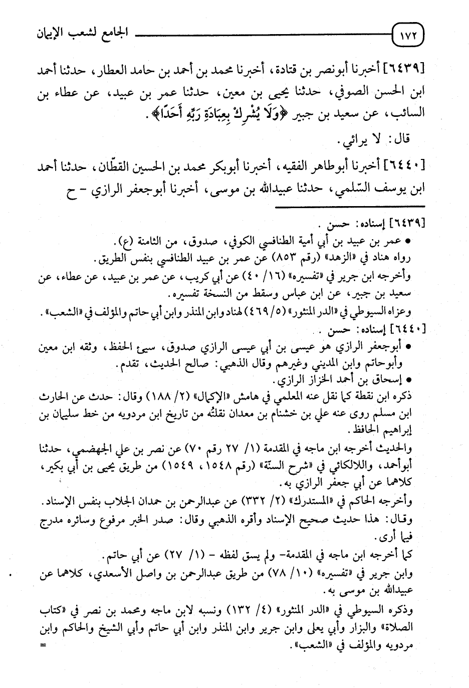 6439 - أَخْبَرَنَا أَبُو نَصْرِ بْنُ قَتَادَةَ، أَنَا مُحَمَّدُ بْنُ أَحْمَدَ بْنِ حَامِدٍ الْعَطَّارُ، نا أَحْمَدُ بْنُ الْحَسَنِ الصُّوفِيُّ، نا يَحْيَى بْنُ مَعِينٍ، نا عُمَرُ بْنُ عُبَيْدٍ، عَنْ عَطَاءِ بْنِ السَّائِبِ، عَنْ سَعِيدِ بْنِ جُبَيْرٍ: {§وَلَا يُشْرِكْ بِعِبَادَةِ رَبِّهِ أَحَدًا} [الكهف: 110]، قَالَ: " لَا يُرَائِي "