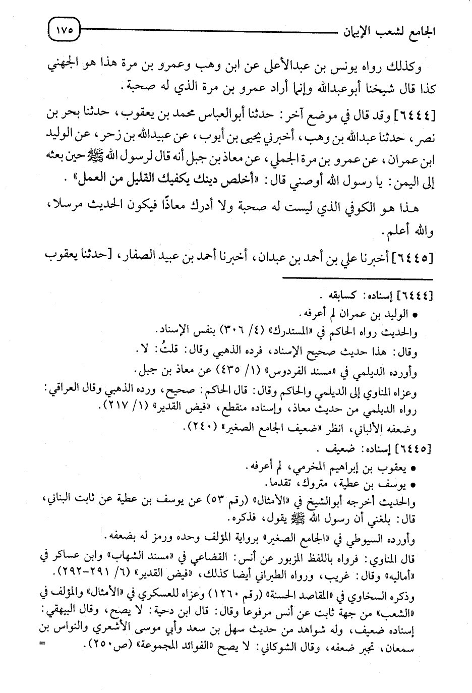 6444 - وَقَدْ قَالَ فِي مَوْضِعٍ آخَرَ نا أَبُو الْعَبَّاسِ بْنُ يَعْقُوبَ، نا بَحْرُ بْنُ نَصْرٍ، نا عَبْدُ اللهِ بْنُ وَهْبٍ، أَخْبَرَنِي يَحْيَى بْنُ أَيُّوبَ، عَنْ عُبَيْدِ اللهِ بْنِ زَحْرٍ، عَنِ الْوَلِيدِ بْنِ عِمْرَانَ، عَنْ عَمْرِو بْنِ مُرَّةَ الْجَمَلِيِّ، عَنْ مُعَاذِ بْنِ جَبَلٍ، أَنَّهُ قَالَ لِرَسُولِ اللهِ صَلَّى اللَّهُ عَلَيْهِ وَسَلَّمَ حِينَ بَعَثَهُ إِلَى الْيَمَنِ: يَا رَسُولَ اللهِ، أَوْصِنِي قَالَ: §" أَخْلِصْ دِينَكَ يَكْفِيكَ الْقَلِيلُ مِنَ الْعَمَلِ ". " هَذَا هُوَ الْكُوفِيُّ الَّذِي لَيْسَتْ لَهُ صُحْبَةٌ، وَلَا أَدْرَكَ مُعَاذًا فَيَكُونَ الْحَدِيثُ مُرْسَلًا وَاللهُ أَعْلَمُ "