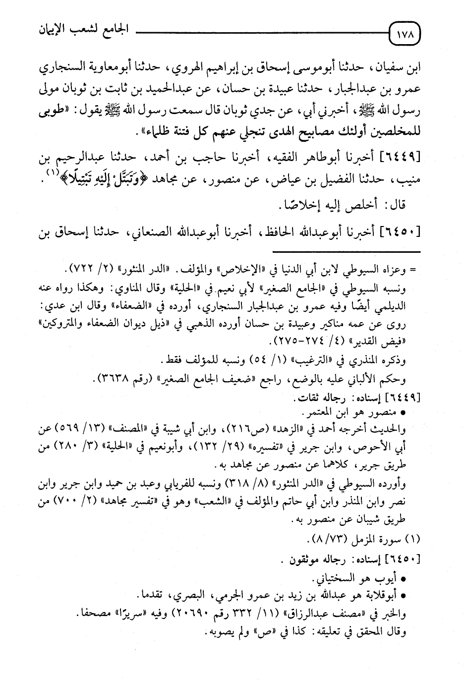 6449 - أَخْبَرَنَا أَبُو طَاهِرٍ الْفَقِيهُ، أَنَا حَاجِبُ بْنُ أَحْمَدَ، نا عَبْدُ الرَّحِيمِ بْنُ مُنِيبٍ، نا الْفُضَيْلُ بْنُ عِيَاضٍ، عَنْ مَنْصُورٍ، عَنْ مُجَاهِدٍ: {§وَتَبَتَّلْ إِلَيْهِ تَبْتِيلًا} [المزمل: 8]، قَالَ: " أَخْلِصْ إِلَيْهِ إِخْلَاصًا "