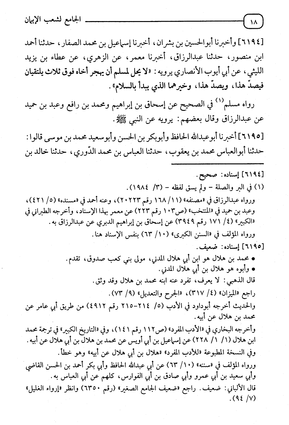 6194 - أَخْبَرَنَا أَبُو الْحُسَيْنِ بْنُ بِشْرَانَ، أَنَا إِسْمَاعِيلُ بْنُ مُحَمَّدٍ الصَّفَارُ، نا أَحْمَدُ بْنُ مَنْصُورٍ، نا عَبْدُ الرَّزَّاقِ، أَنَا مَعْمَرٌ، عَنِ الزُّهْرِيِّ، عَنْ عَطَاءِ بْنِ يَزِيدَ اللَّيْثِيِّ، عَنْ أَبِي أَيُّوبَ الْأَنْصَارِيِّ، يَرْوِيهِ: §" لَا يَحِلُّ لِمُسْلِمٍ أَنْ يَهْجُرَ أَخَاهُ فَوْقَ ثَلَاثَةٍ يَلْتَقِيَانِ فَيَصُدُّ هَذَا، وَيَصُدُّ هَذَا وَخَيْرُهُمَا الَّذِي يَبْدَأُ بِالسَّلَامِ " رَوَاهُ مُسْلِمٌ فِي الصَّحِيحِ، عَنْ إِسْحَاقَ بْنِ إِبْرَاهِيمَ، وَمُحَمَّدِ بْنِ رَافِعٍ، وَعَبْدِ اللهِ بْنِ حُمَيْدٍ، عَنْ عَبْدِ الرَّزَّاقِ، وَقَالَ بَعْضُهُمْ: يَرْوِيهِ، عَنِ النَّبِيِّ صَلَّى اللَّهُ عَلَيْهِ وَسَلَّمَ