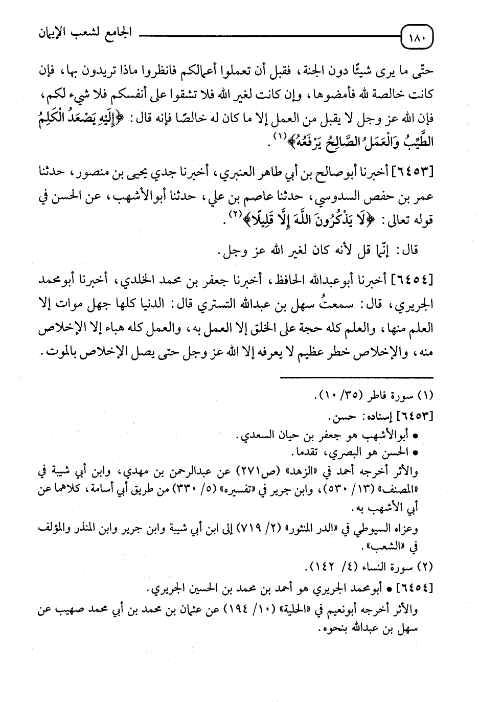 6454 - أَخْبَرَنَا أَبُو عَبْدِ اللهِ الْحَافِظُ، أَنَا جَعْفَرُ بْنُ مُحَمَّدٍ الْخلديُّ، أَنَا أَبُو مُحَمَّدٍ الْجُرَيْرِيُّ، قَالَ: سَمِعْتُ سَهْلَ بْنَ عَبْدِ اللهِ التُّسْتَرِيَّ، قَالَ: " §الدُّنْيَا كُلُّهَا جَهْلٌ مَوَاتٌ إِلَّا الْعِلْمَ مِنْهَا، وَالْعِلْمُ كُلُّهُ حُجَّةٌ عَلَى الْخَلْقِ إِلَّا الْعَمَلَ بِهِ، وَالْعَمَلُ كُلُّهُ هَبَاءٌ إِلَّا الْإِخْلَاصَ مِنْهُ، وَالْإِخْلَاصُ خَطْبٌ عَظِيمٌ لَا يَعْرِفُهُ إِلَّا اللهُ عَزَّ وَجَلَّ حَتَّى يَصِلَ الْإِخْلَاصُ بِالْمَوْتِ "