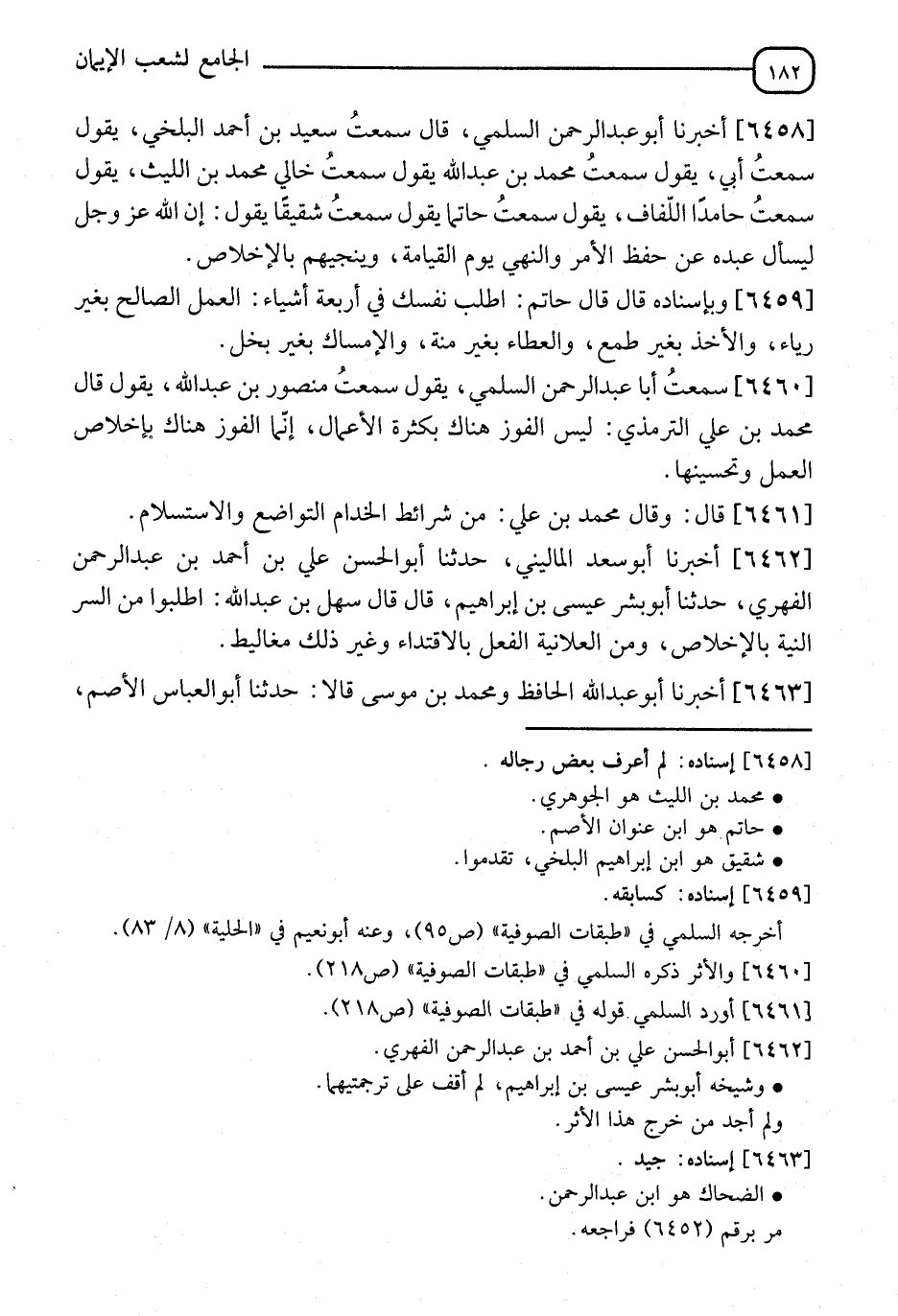 6458 - أَخْبَرَنَا أَبُو عَبْدِ الرَّحْمَنِ السَّلَمِيُّ، قَالَ: سَمِعْتُ سَعِيدَ بْنَ أَحْمَدَ الْبَلْخِيَّ، سَمِعْتُ أَبِي، يَقُولُ: مُحَمَّدُ بْنُ عَبْدِ اللهِ، يَقُولُ: سَمِعْتُ خَالِي مُحَمَّدَ بْنَ اللَّيْثِ، يَقُولُ: سَمِعْتُ حَامِدًا اللَّفَّافَ، يَقُولُ: سَمِعْتُ حَاتِمَ الْأَصَمَّ، يَقُولُ: سَمِعْتُ شَقِيقًا، يَقُولُ: " إِنَّ §اللهَ عَزَّ وَجَلَّ يَسْأَلُ عَبْدَهُ عَنْ حِفْظِ الْأَمْرِ وَالنَّهْيِ يَوْمَ الْقِيَامَةِ وَيُنَجِّيهِمْ بِالْإِخْلَاصِ "