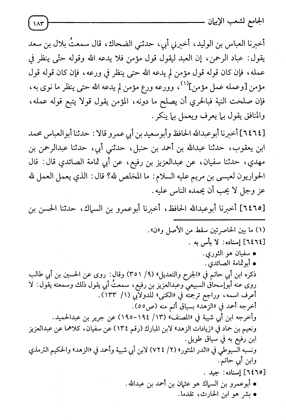 6464 - أَخْبَرَنَا أَبُو عَبْدِ اللهِ الْحَافِظُ، وَأَبُو سَعِيدِ بْنُ أَبِي عَمْرٍو، قَالَا: نا أَبُو الْعَبَّاسِ مُحَمَّدُ بْنُ يَعْقُوبَ، نا عَبْدُ اللهِ بْنُ أَحْمَدَ بْنِ حَنْبَلٍ، حَدَّثَنِي أَبِي، نا عَبْدُ الرَّحْمَنِ بْنُ مَهْدِيٍّ، نا سُفْيَانُ، عَنْ عَبْدِ الْعَزِيزِ بْنِ رُفَيْعٍ، عَنْ أَبِي ثُمَامَةَ الصَّائِدِيِّ، قَالَ: " قَالَ الْحَوَارِيُّونَ لِعِيسَى ابْنِ مَرْيَمَ عَلَيْهِ السَّلَامُ: §مَا الْمُخْلِصُ لِلَّهِ؟ قَالَ: الَّذِي يَعْمَلُ الْعَمَلَ لِلَّهِ عَزَّ وَجَلَّ، وَلَا يُحِبُّ أَنْ يَحْمَدَهُ النَّاسُ عَلَيْهِ "
