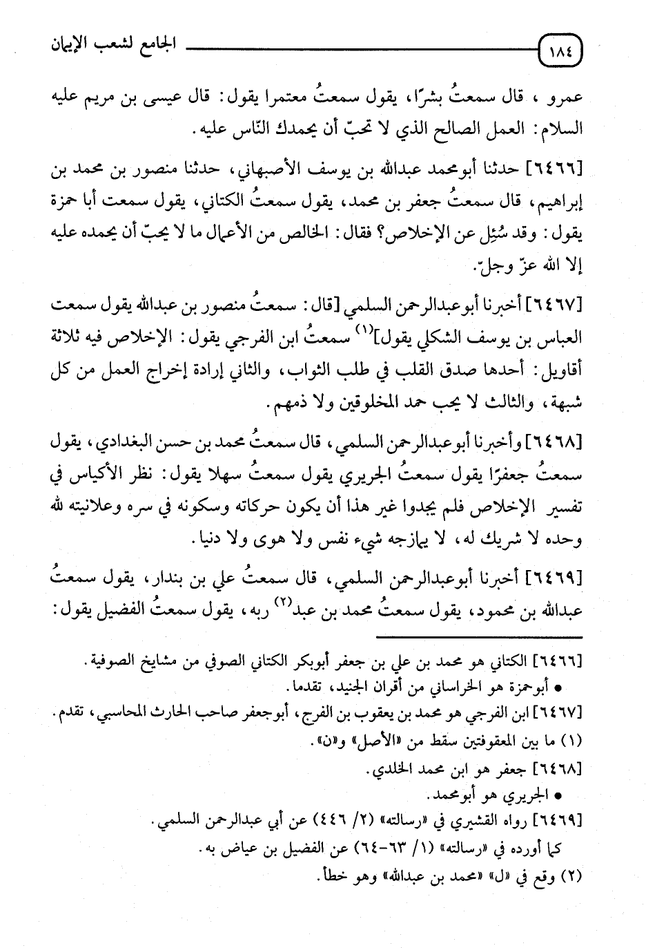 6468 - وَأَخْبَرَنَا أَبُو عَبْدِ الرَّحْمَنِ السَّلَمِيُّ، قَالَ: سَمِعْتُ مُحَمَّدَ بْنَ الْحَسَنِ الْبَغْدَادِيَّ، يَقُولُ: سَمِعْتُ جَعْفَرًا، يَقُولُ: سَمِعْتُ الْجُرَيْرِيَّ، يَقُولُ: سَمِعْتُ سَهْلًا، يَقُولُ: " §نَظَرَ الْأَكْيَاسُ فِي تَفْسِيرِ الْإِخْلَاصِ، فَلَمْ يَجِدُوا غَيْرَ هَذَا أَنْ يَكُونَ حَرَكَاتُهُ وَسُكُوتَهُ فِي سَرِّهِ وَعَلَانِيَتِهِ لِلَّهِ وَحْدَهُ لَا شَرِيكَ لَهُ لَا يُمَازِجُهُ شَيْءٌ نَفْسٌ، وَلَا هَوًى، وَلَا دُنْيَا "